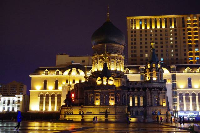 下午一点多到的哈西站,坐车到中央大街时已经是3点多了,正好逛了下中央大街,找好宾馆吃完晚饭后,天也黑了,这是正是逛圣.索菲亚教堂夜景的好机会哦!