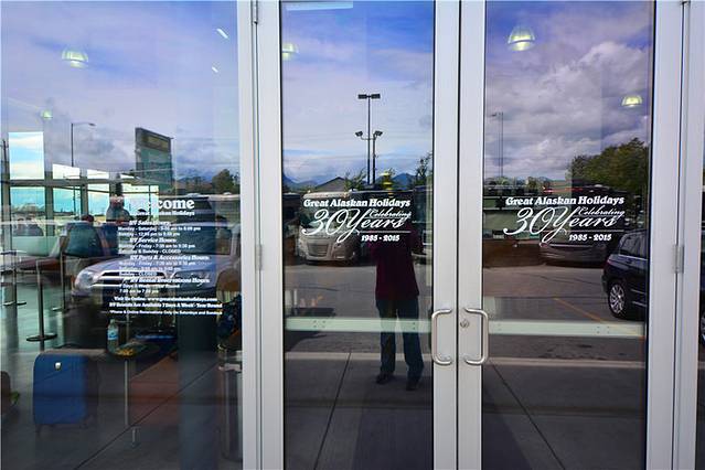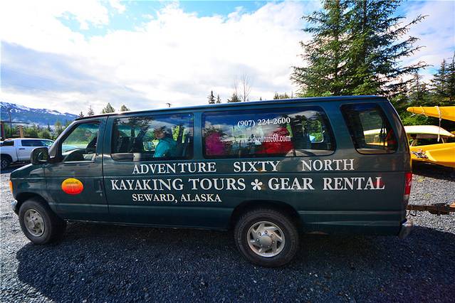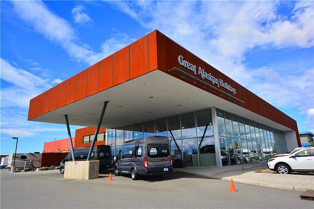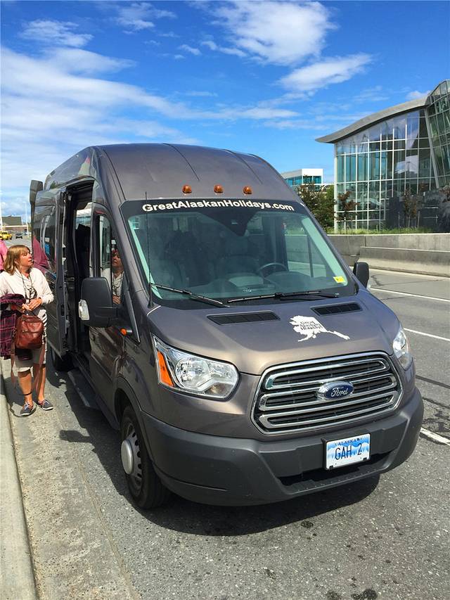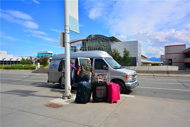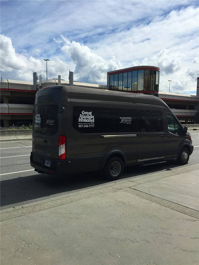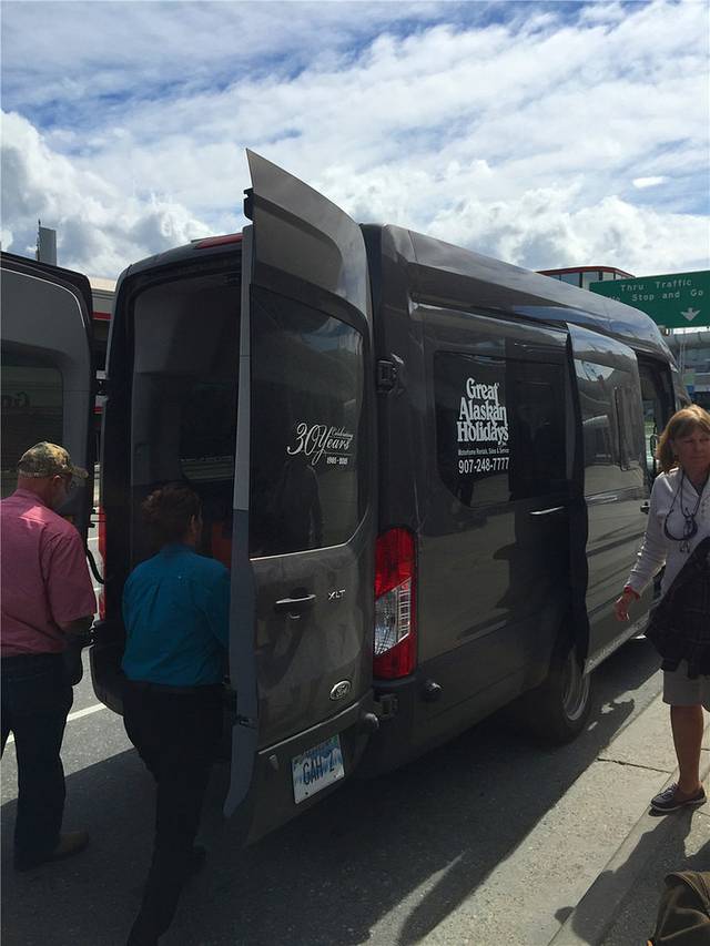 Great Alaskan Holiday有自己的免费接驳车,到了机场以后打个电话给公司,公司就派车来接。派车的速度取决于当时那个时候的繁忙程度,我们当时是上午十二点,似乎有一个团队刚结束还车要回来,所以等了比平常多两倍的时间,大概三十分钟才见到车子。很后悔电话打晚了,应该提前打电话而不是到了机场再叫。GAH的接送车是咖啡色的,上面有公司logo还是比较好认。Shuttle司机特别友好,在送我们去公司的路上一直和我们攀谈着,得知我们第一次来,介绍了很多阿拉斯加的风土人情。在唠嗑中,我们得知了一个巨大的噩耗,我们本来准备去的seward waterfront RV park可能因为独立日的seward国际马拉松而被各位慕名而来的马友早早的占满了。我们怀着将信将疑的态度打了个电话给公园管理处,得到了一种美式的温柔拒绝---你们先开过来看看吧,说不定有人先走了呢?开玩笑,这种话我要是听了我也可以别混了。后来我们去seward闲逛时的事实证明—火爆爆满。电话打完,司机阿姨很有经验,安慰我们开的是房车,房车就是个房子啊,只要能停个地儿也就够了。她说如果没位置,路边的turnout(港湾式停靠风景点)过夜也没问题,而且风景还比真正的RV park好。