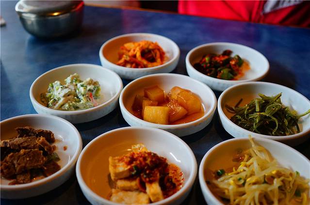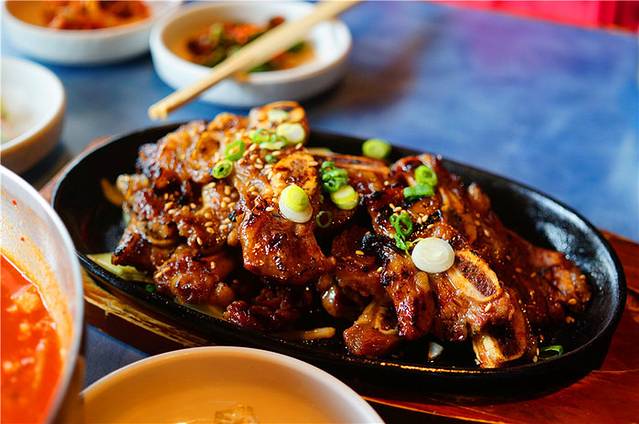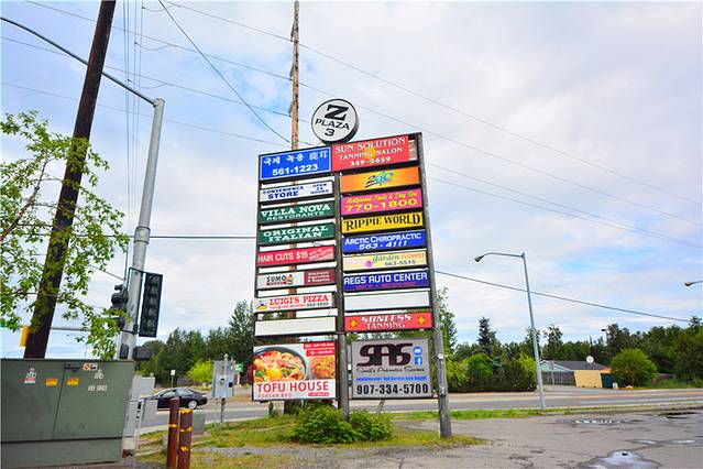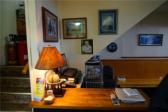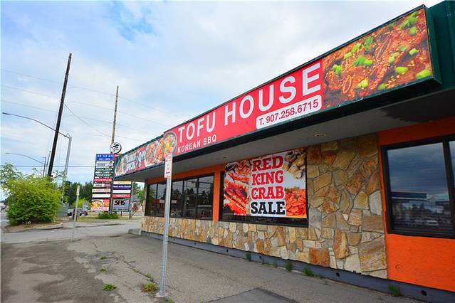 这个餐厅其实在上午散步的时候已经看见了,在一个所谓的plaza里。有那种前后两个连着的停车位用于停RV,感觉不错,可惜人家上午十一点才开门,不卖早饭的。餐厅内部分两块,一块是吧台,一块是用餐区。装修风格是美式牛排馆那种昏暗格调,但是在墙上的一排菜单介绍了它的韩国餐馆的特性。那天我们开着超大房车摇摇晃晃的过去已经好晚了,中饭时间已经过了,不过也好,有太多人你也不好意思举着相机对着店里拍照。老板说这里中午有十个中国人来用餐,看来自从有了十年签证,来阿拉斯加的朋友们不少啊。