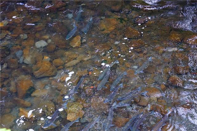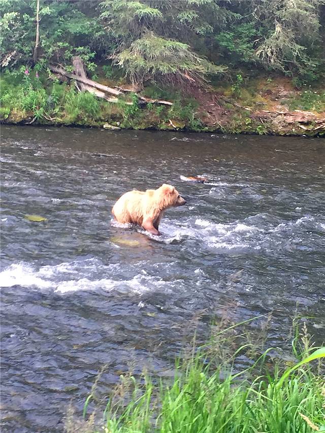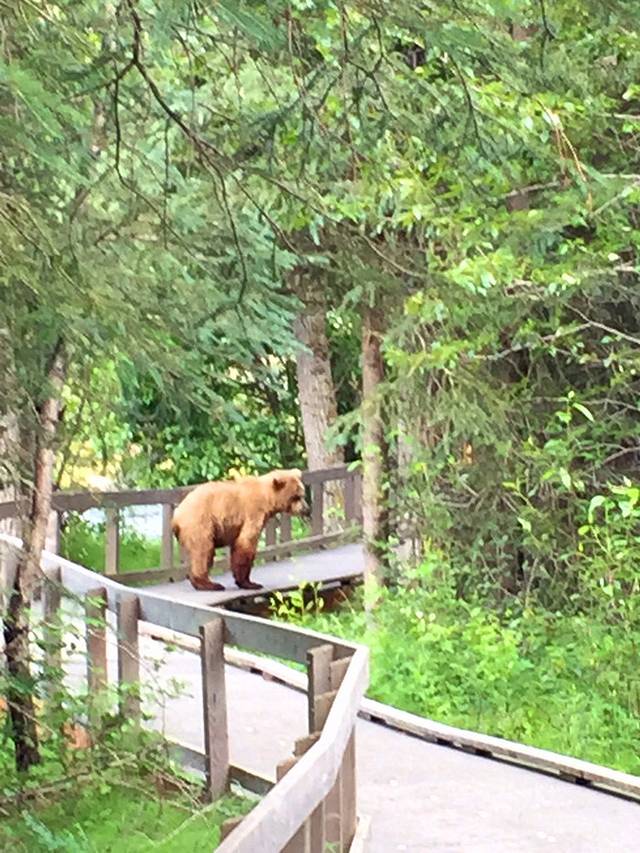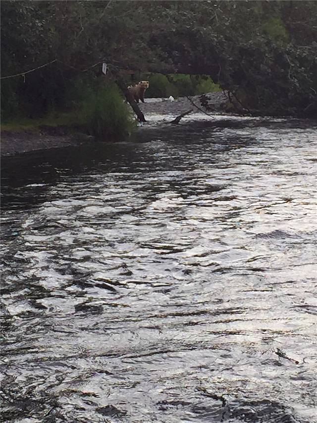 刹那间,熊就从河里走到trail上来了,妈蛋一群人迅速奔跑着说回去拿枪,一眨眼就没了,那我呢?我连喷雾都没有。。。人多力量大,我们三只能跟着一个骑自行车大哥后面,不停的用软糯的声音喊:“Hi, Bear!”希望此时卖萌能管用。