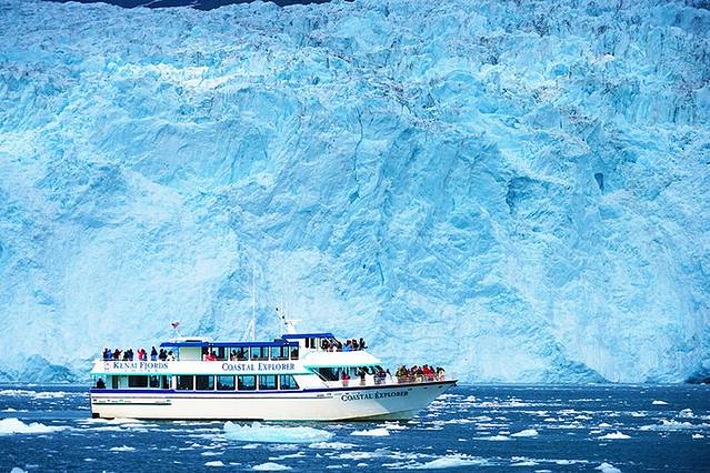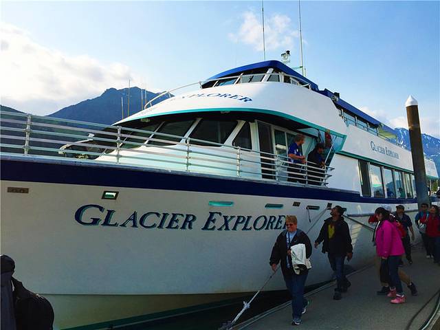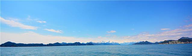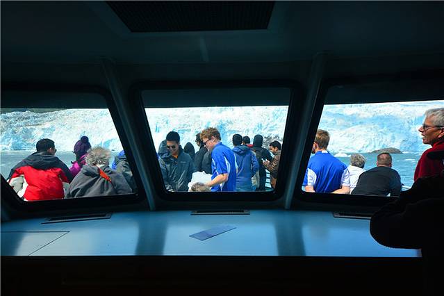 奇奈峡湾国家公园是阿拉斯加唯一的通过公路可到达的国家公园,园内有美国最大的冰原——哈丁冰原。这个巨型冰原孕育了40多条大小不一的冰川,形成了园内最吸引眼球的景观。探索这个奇幻的国家公园是一次野生动物的探寻和冰川欣赏之旅,游客可乘游船到奇奈峡湾观看入海冰川和海洋动物。我们预定的是8.5小时National Park Tour with Fox Island dinner,172刀每个人,预定好了以后,当天乘船的早上在海港的Kenai Fjord office checkin 取票,排队登船。Tips:建议去早一点,这样的话,可以先进去坐在边上的位置,看风景和动物比较好尤其是怕风浪,怕冷的同志们。当然啦,如果你要拍最漂亮的动物,那还是要跑到夹板上受冻的,因为各层玻璃还是觉得雾蒙蒙的,而且你不能保证动物出现在你的这一个侧面。然后是镜头,我们发现阿拉斯加观鲸和海鸟平均距离比其他地方的tour大一些,所以建议携带200mm以上的长焦镜头。各种峡湾,冰川等地貌24mm左右广角就可以了,超广不是很需要。然后就是脚架,建议是不要带,要带最多带个独脚架,大家都是鲸鱼在左边,嗖地一下冲到左边,右边来了海鹦鹉,刷的一下全跑右边。尤其美国佬,属于那种到了关键时刻就只管自己往前压的,平时的伪善暴露无遗,真是一个奇幻的国度。