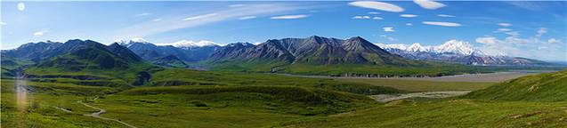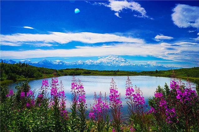 感觉太好了,不过根据前人(前天碰到的人)的经验,他在denali待了九天,一天麦金利都没看到,最后坐小飞机冲上云霄看去了。。。所以说,人还是要靠天吃饭的,如果云多,请向下看,看动物吧。这件事是这样的,如果没云,denali是阳光直射,闷热无比,难以忍受。你想熊皮那么厚,才不愿意从密林里出来玩呢。那么denali其实现在,也就是七月初是最好的,第一个,颜色全部出来了,野花正艳,小草油绿。第二个,不冷不热,你不需要穿着大棉袄。也不会穿着短裤还想脱。