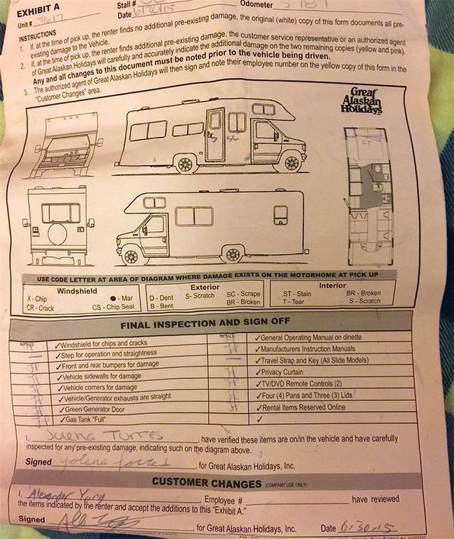C.那么驾照验完了就开始签各种各样的合同,驾照和住址信息。这个公司很奇怪,信用卡刷的伍佰元押金非要用check邮寄回我们家,而不是打回信用卡,和租房子的房东一样,不过也好,白赚500点信用卡点数。填完了,小哥开始推销各种用品,首先是油要不要买一箱,这样回来的时候不要加了,然后是丙烷气要不要选一罐,否则你还车的时候还要找人加,再是你们要不要来租点烧烤架,逆变器和小座椅呢?这些我们要么准备好了,要么不需要,就都没定。