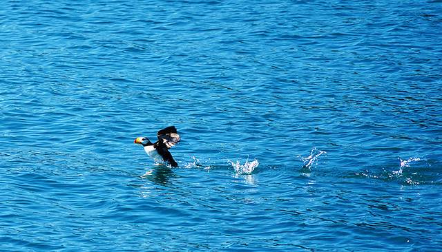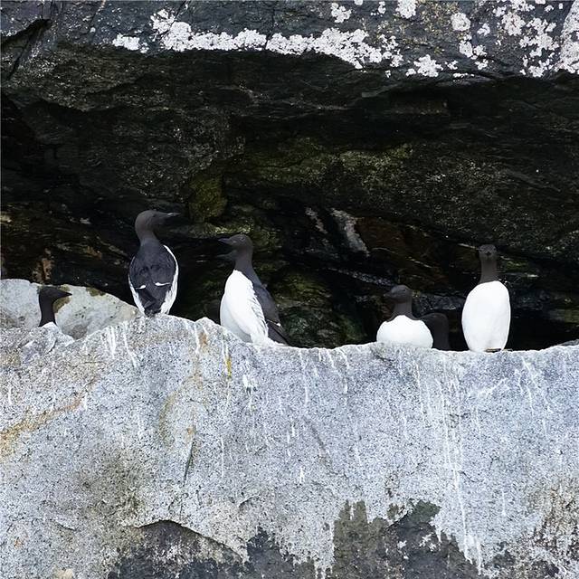 Coomon Murre(崖海鸦),看起来好呆萌。这种海鸟可以下潜至水下195米处。他们多数时候是在水上度过的,只有要养育后代才来到悬崖上安家。高尔基是这样说的,在乌云和大海之间,海燕像黑色的闪电高傲地飞翔。没办法有的鸟儿飞的太快,三亿像素点的人眼能够看见,可是却照不下来,只有等你来亲自体验这些一色海天间美丽生灵。