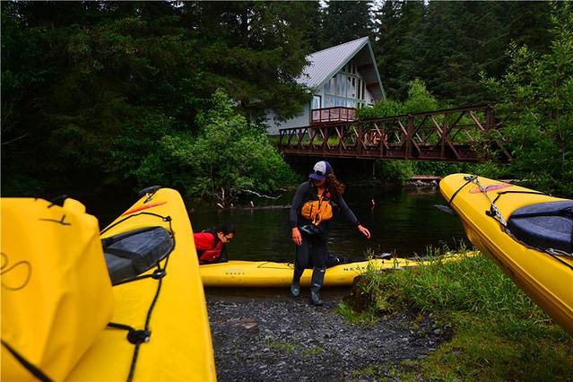到了以后首先交清余款。刷完卡后去隔壁小房间取胶鞋,防水袋。照相机这个时候可以放在防水袋中,看见好风景可以拿出来。当然也可以直接挂在胸前,直接硬上,我就是这样。到了bear lake的最深处,两位向导把船拉到地上,开始安全教育。告诉你怎么穿上救生衣,怎么穿上防水罩,如果船翻了怎么迅速拿下防水罩之类的云云。然后就是技术指导,怎么划桨(感觉和我当年练习的划龙舟不太一样,桨片是侧入水,而不是直着插下去),怎么排水,怎么转弯。弄好以后就上路了。