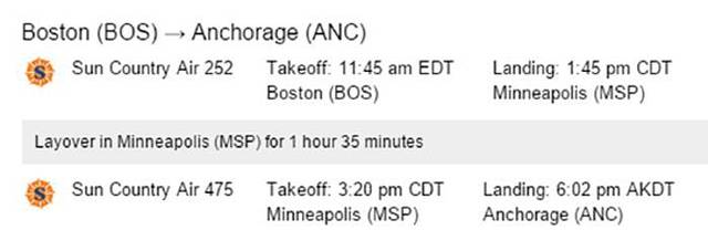 我们从波士顿(BOS)出发到安克雷奇(ANC),最短行程也要飞十个小时,真的好远好远,所以选择价钱和时间的平衡很重要。
