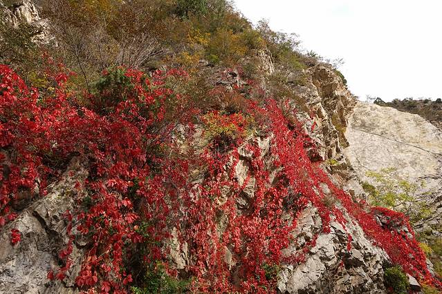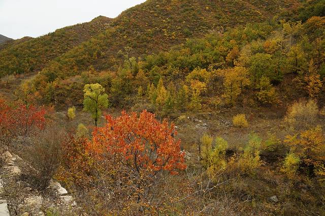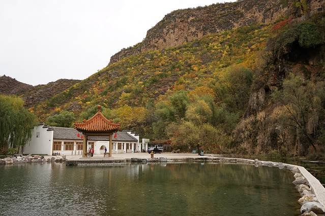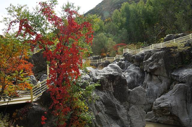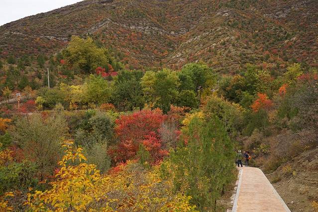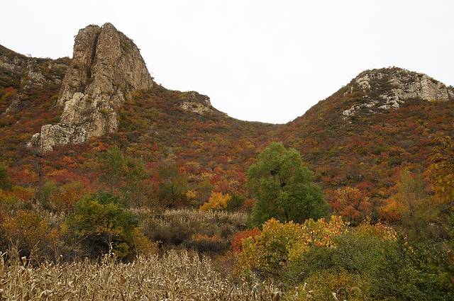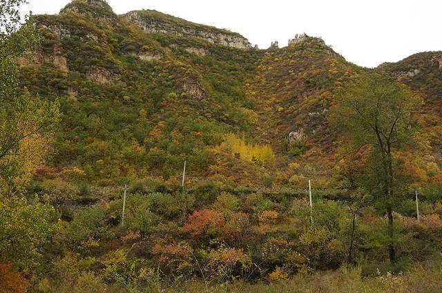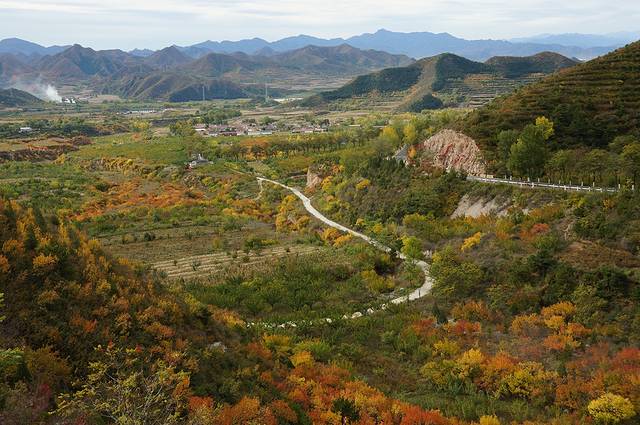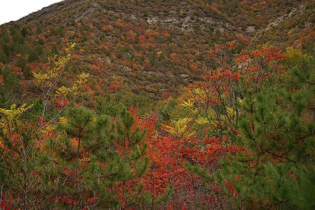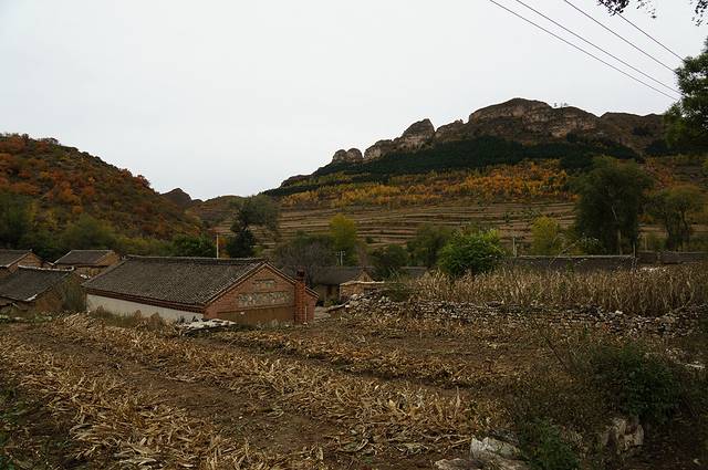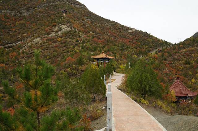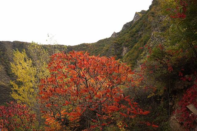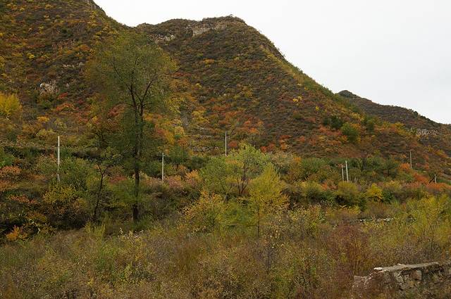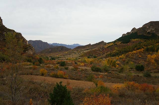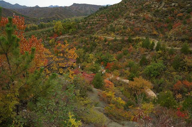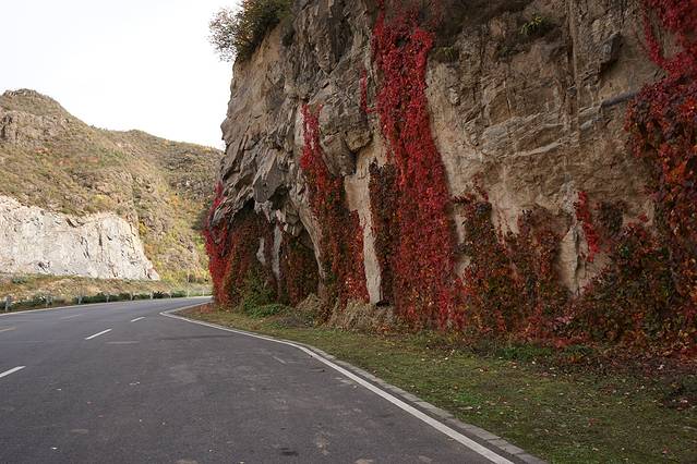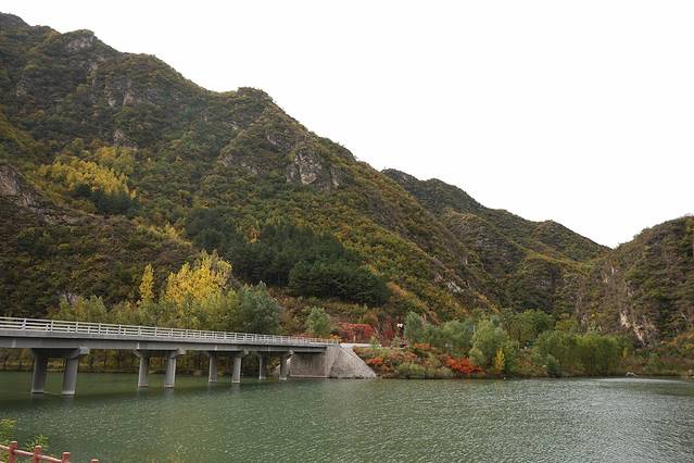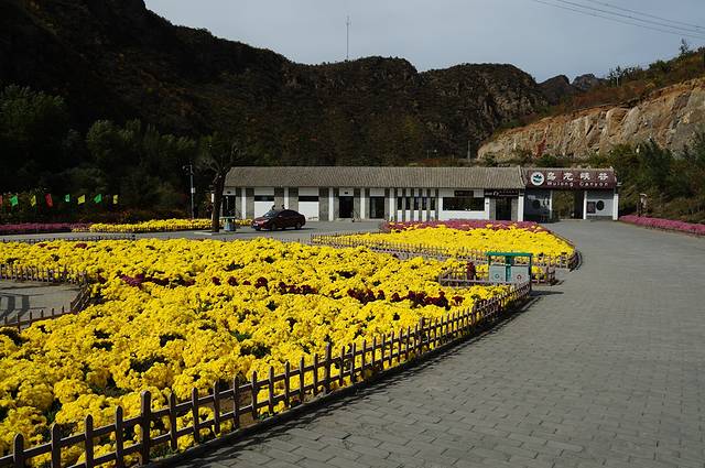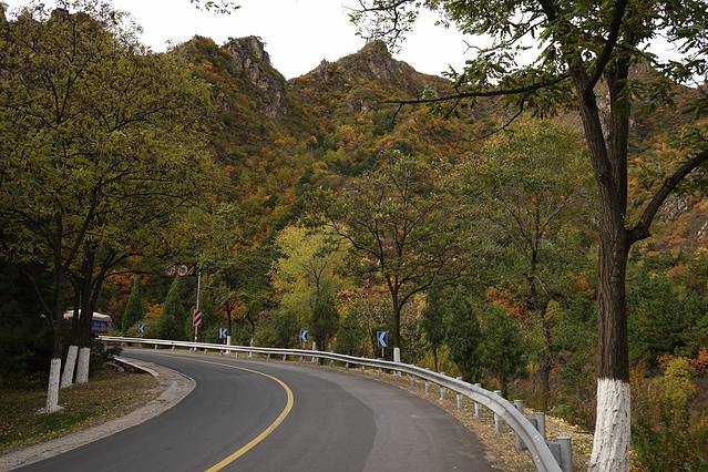 10月12日,自驾前往,早上7点出发,走京藏高速(G6)过了八达岭下道,往延庆方向直行,走到头有路标去往“百里山水画廊”有时路标写成“千家店生态景区”,反正是一个地方。我们路过沈家营、永宁镇、刘斌堡,走刘干路到达干沟。进入景区。