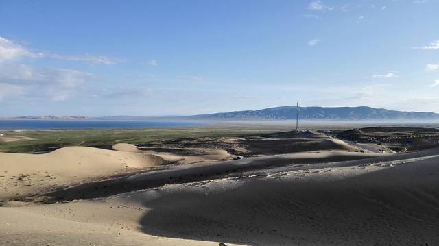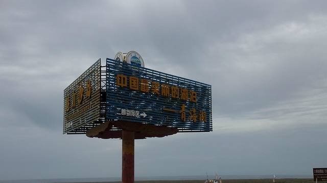 这一段路程基本都是离湖较远,但远远望去,青海湖的美景依然无法掩盖。因为天色已晚,加之天气不好,我们没有逗留,快马加鞭赶往湖东种羊场。从出发大概一个小时多一点的时间后,我们到达了湖东种羊场。风很大,卷起的风尘漫天飞舞,有种电影《无人区》里的感觉。这是一个很小的镇子,只有街道两边有一些人家,我们按照骑兵营老板给的联系方式找到了镇子上的荣华饭店,在这里吃了饭。饭菜有些贵,感觉比上海的都贵,一份番茄鸡蛋盖浇饭大概要20块钱。吃饭饭之后,就在店家的旅社里住了下来,住宿不算贵,40元/人,但住宿条件很简陋。