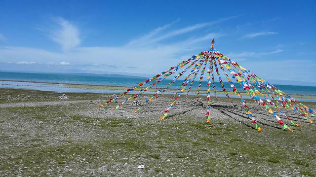 再往后的这一段路程都是离湖很近,风景很好。湖边有很多藏民的寨子以及他们的经幡。