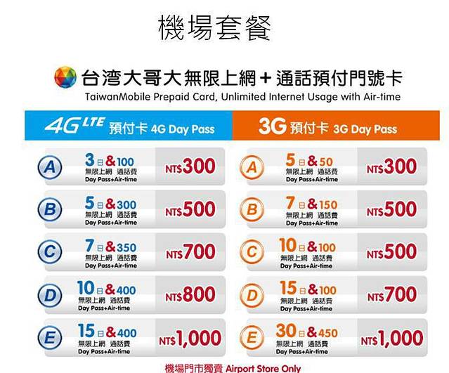 台湾大哥大手机卡分别有3日、5日、7日、10日等不同的套餐,在桃园机场就有出售,