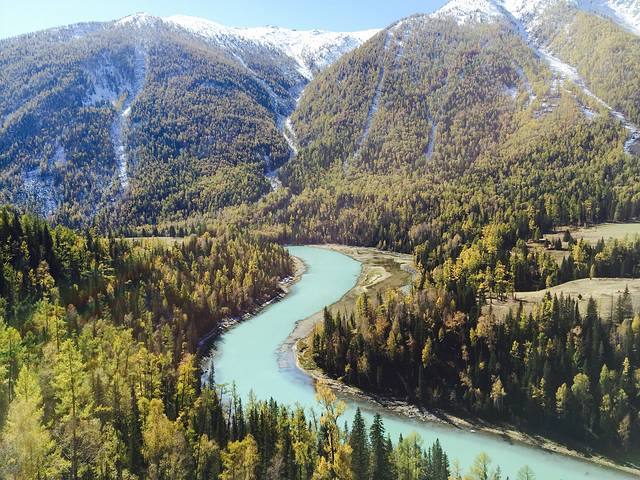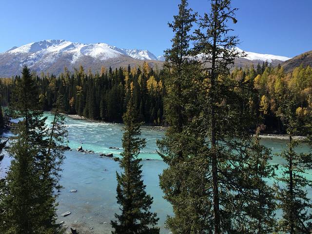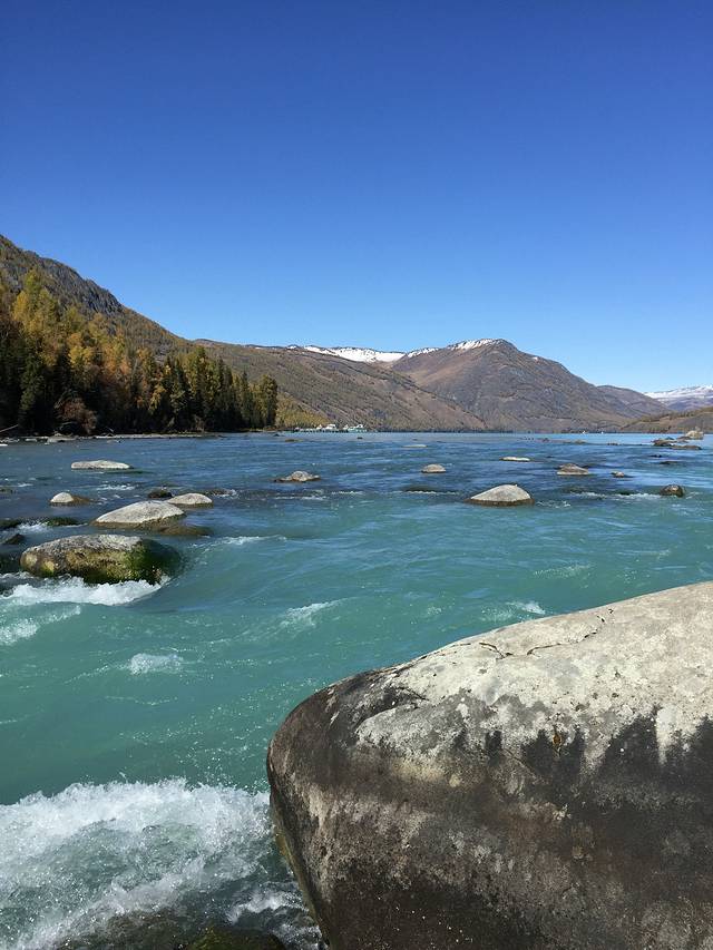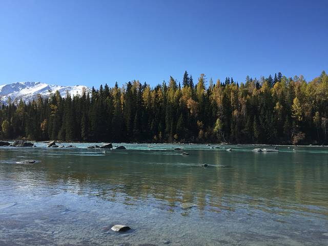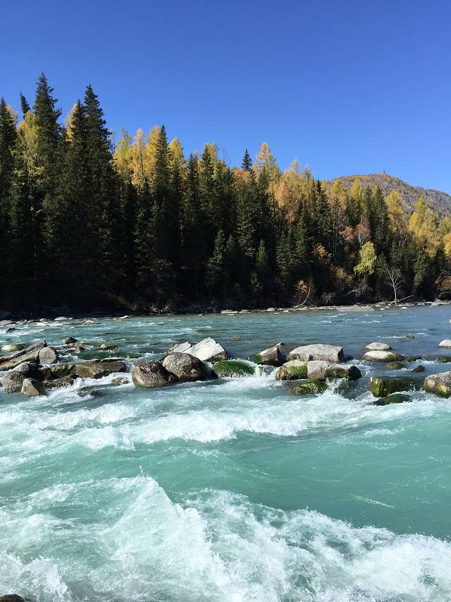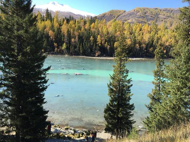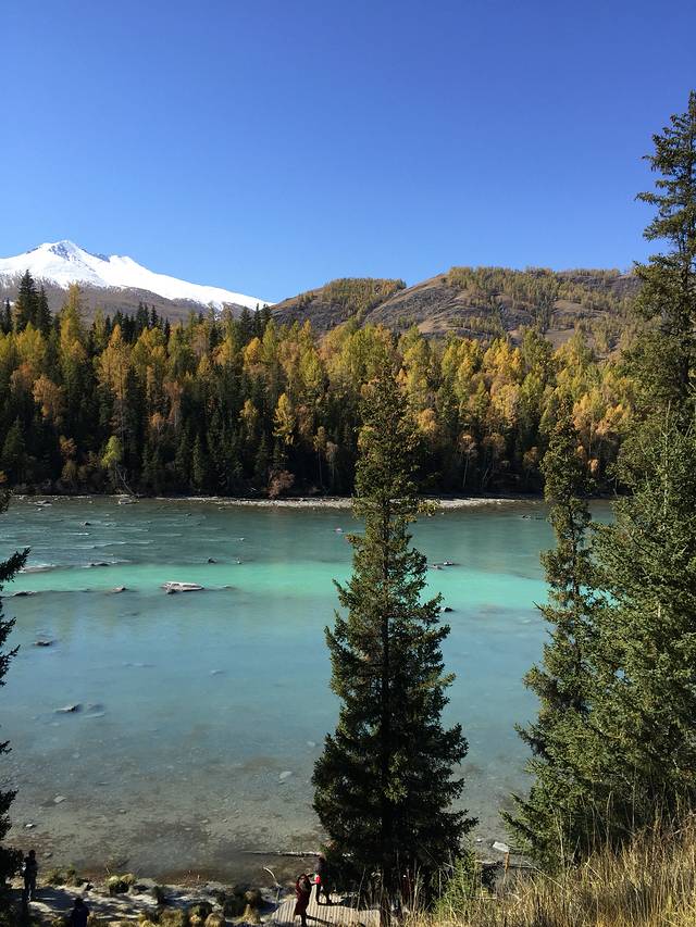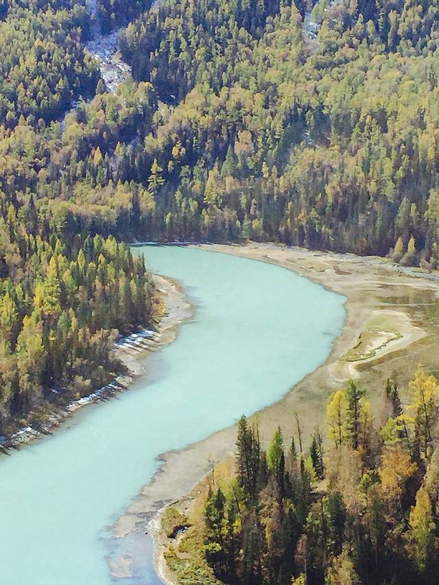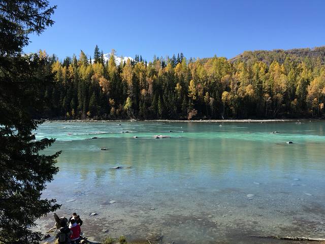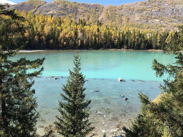 终于看到有湖怪的喀纳斯了湖了...怎么形容它呢?就像是不经意间突然在你眼前跳出了一个蓝绿色的缎带,波光鳞鳞,那样清澈,让人清净安心。缎带的颜色不止一种,阳光的照耀使它一会变成了宝石蓝,一会天青蓝,偶尔还有孔雀蓝……(原谅我乏味的形容词...)
