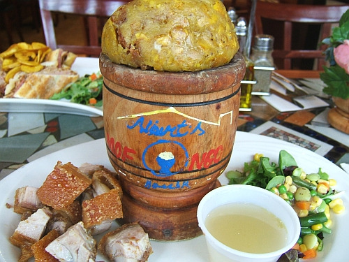 Mofongo:算是当地一种特色菜,盛在一个小木桶里,里面用大蕉做的泥加调料为底,上面加上牛肉或者海鲜。感觉大蕉在当地像是土豆一样的存在,主食就是大米和大蕉。大蕉的口感也和土豆差不多,嚼起来比土豆纤维感多一些,本身没有味道。