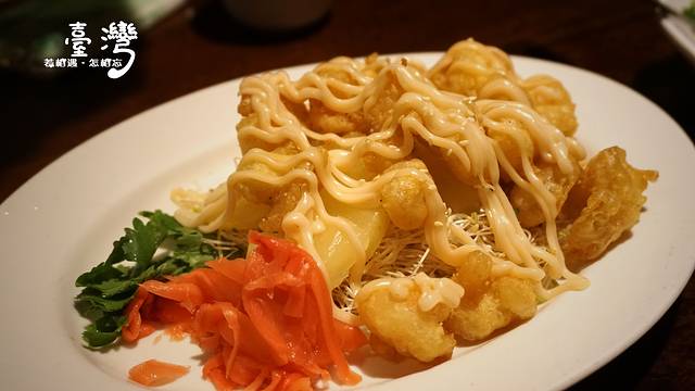 凤梨虾球,酸甜可口。当酸味和甜味这两种个性鲜明的味道纠缠在一起时,并没有任何不和谐的感觉,相反略带酸味的凤梨提升了菜肴整体的鲜香度,而甜味也变得更加灵动通透,使得虾肉更为Q弹爽口。200台币/份。