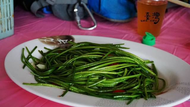 台湾当地有种蔬菜挺有意思,似乎没在别处尝过。细细长长呈条状,碧绿色的一捆扎在一起很是好看,店主说这是水莲,猜想应该是睡莲科植物的根茎吧。菜水莲口感丰富独特,配上蜜饯般酸酸甜甜的朴子(猜测为朴树果实)作为点缀,别有一番风味。