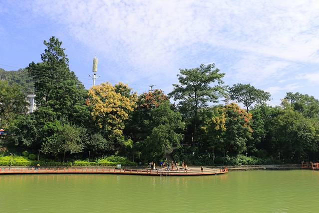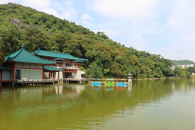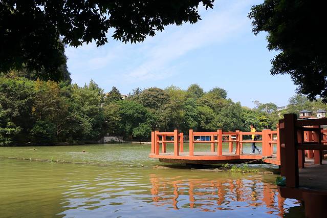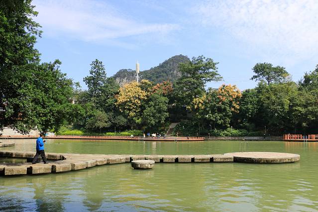 桂湖是桂林“两江四湖”景点的重要组成部分,市内交通发达,可乘坐公交乘坐100,到达凤北路口,乘坐99,到达凤北路口,乘坐22,到达宝贤桥到达景区。这里没有门票完全免费,但也可以花钱坐船游览。桂湖是桂林“两江四湖”中最大的湖泊,这里是天然的游泳场,因为已经进入十月初秋,在水中嬉戏的人也只有零零星星的少数人。这里也是天然的垂钓场地,环湖一周,发现了许许多多的人在树荫下垂钓。