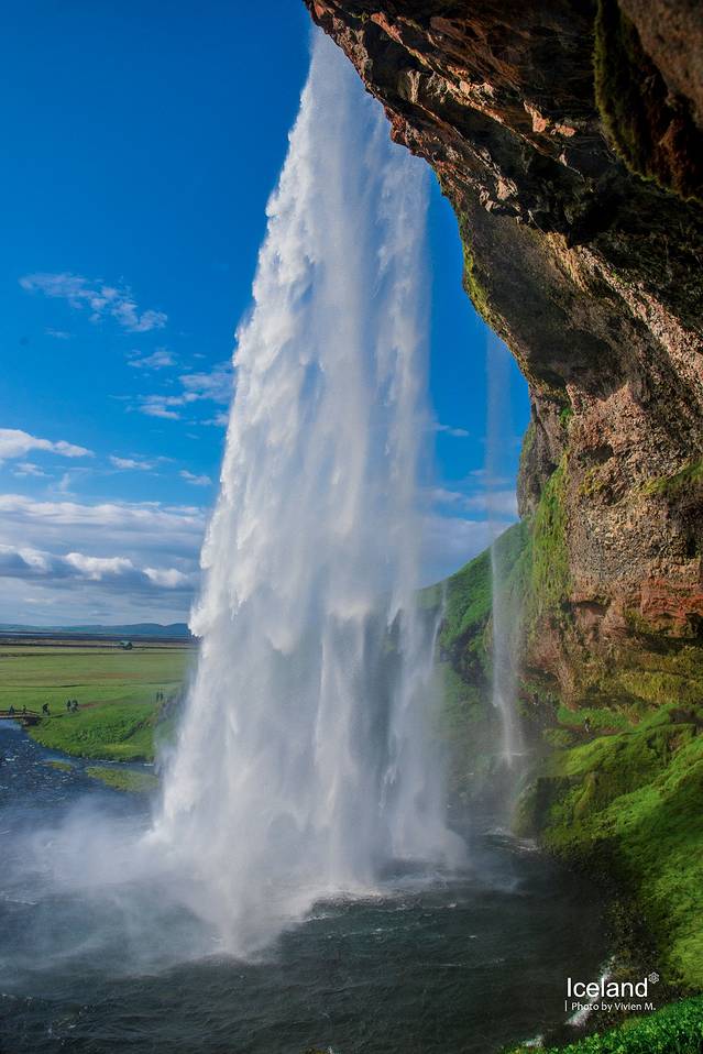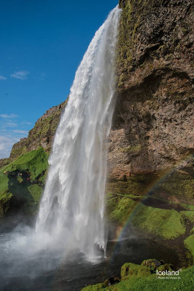 Seljalandsfoss离Skogar只有大概30公里,60米高,算是另一个声名在外的瀑布。它特别的地方在于,有一条狭窄的步道可以走到瀑布的背面,是真正的水帘洞。我们去的那天彩虹持续了特别长的时间,当你走到瀑布背面,依然有一道彩虹横挂在那里,好像触手可及。