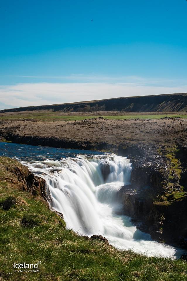 Kolugljúfur是在Víðidalur山谷里的一处瀑布,下一号公路需要开上那么一段土路,算是很小众的景点吧。这个瀑布的特别之处是你看不到汹涌而来的湖水,平静地湖面在突然之间就垂直而下了。