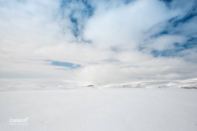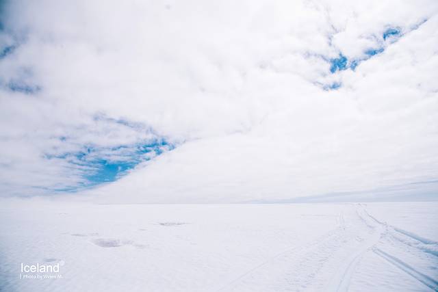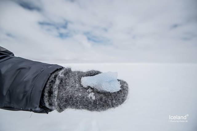 当向导说,We are now on the top of Mýrdalsjökull, 我们才下了车好好环顾四周。白色,只有白色。不远处已分不清是雪原还是云层,积雪很厚,一深一浅地走了几步,向导示意我们可以尝尝雪山之巅的冰。随手抓了一把,晶莹剔透中透着蓝色,这里也只有纯净可以形容了。