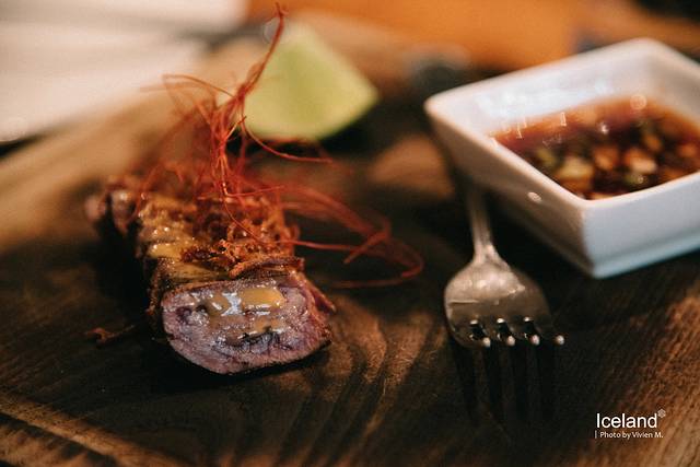 晚餐挑了tripadvisor上排名靠前的一家店,叫Grillmarkadurinn,以烧烤为主,试了tasting menu,总的来说也算吃得心满意足,大部分是鱼,各种叫不上名字的鱼,但我觉得最好吃的是牛肉,那个小汉堡里面夹得时鲸鱼肉和puffin肉,一想到刚刚才看过那些萌物们我就下不了口...
