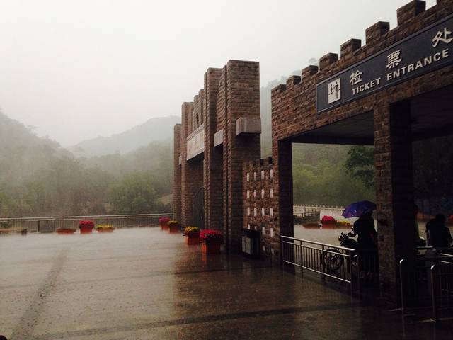 不知道是季节的特殊性还是我们赶上了好日子,由于我这个懒货的拖延,外加我蜗牛似的驾车风格,中午12点出发下午2点到了景区门口,中午出门的时候那是晴空万里,到了景区就阴云密布,本来不打算住宿的,可看了看天气还是决定下住下了,不得不说这是个英明的决定啊,因为我们找完住宿以后欠欠的去景区门口踩点的时候,搭配着闪电雷鸣的瓢泼大雨就登场了,我们都还没来得及看一眼门票价格,就被大雨拍在了景区门口,好在门口有个休息区,果断的钻进去找了个沙发坐,景区里很多拓展的团队和游客们都是淋着雨跑出来的,看来这种天气还是备着点雨伞的好呢。