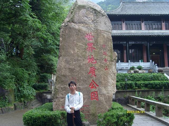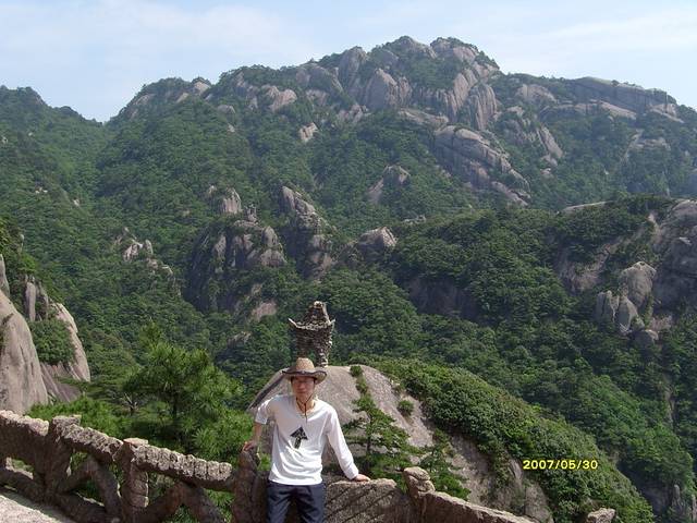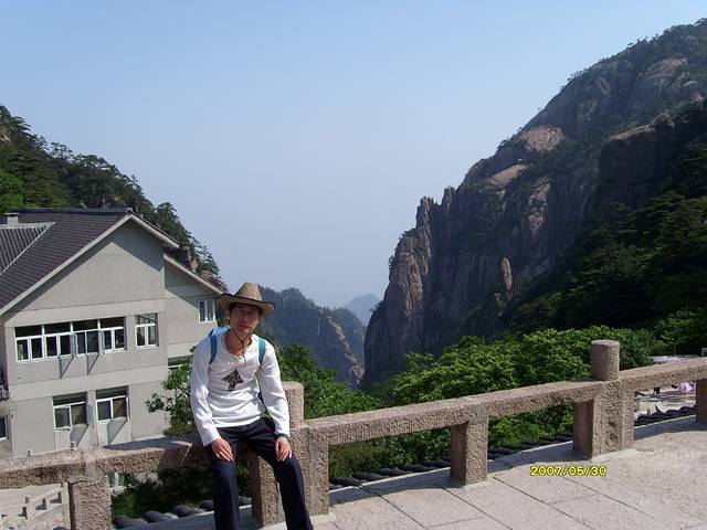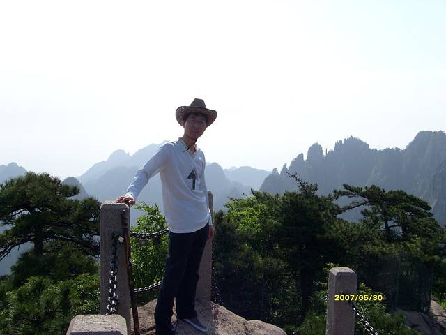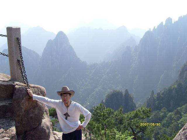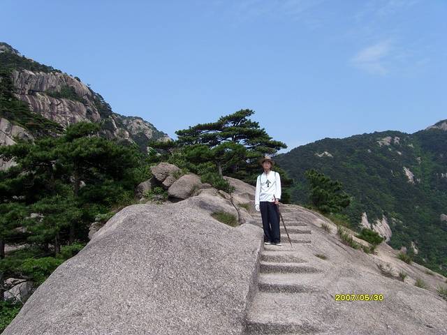 继续向海心亭进发,这儿07.5.31经过时雾气很大,当时拍的张照片像在浴室里。过海心亭有两条路,鳌鱼峰(下有洞)和一线天(路窄一般上行),这个一线天没西海大峡谷那个好但也还可以,我07.5.31下雨时走过,石缝里风好大,一般人尤其是跟导游的团队都走鳌鱼峰这条路,走过鱼头后在下面转弯处平台石板凳坐了会,感觉有点热了脱了黑薄绒衫让雪白的心灵登山服感受灿烂阳光的拥抱吧...天都,我来了