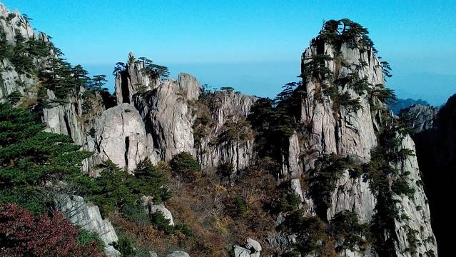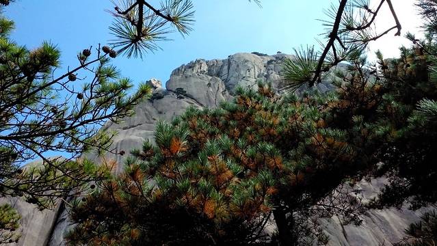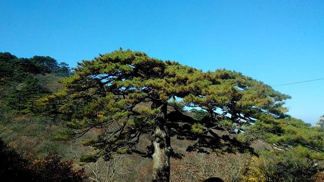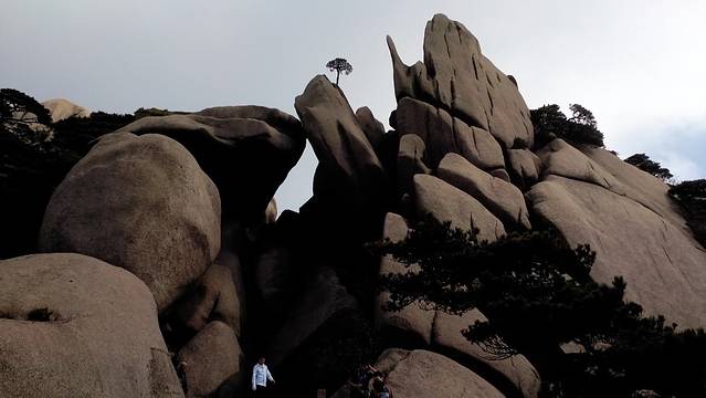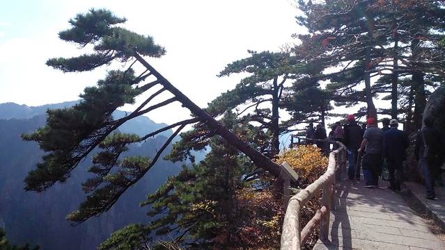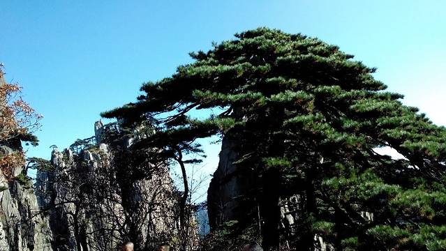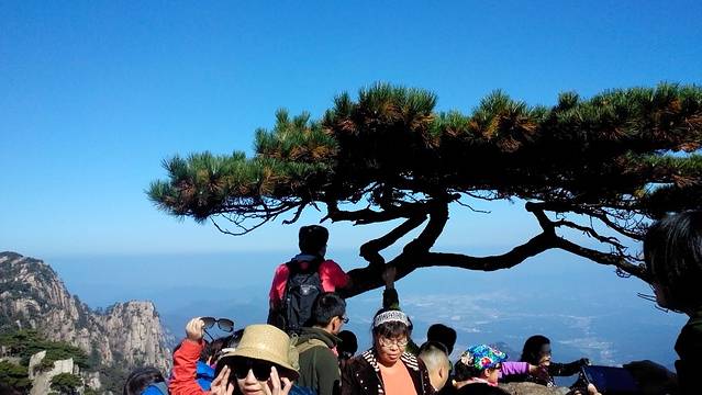 大名鼎鼎的迎客松就在玉屏楼旁有八百岁了,因身姿如张开双臂迎接宾朋故得名。黄山松的祖先是油松,历千百万年演变根能穿透发酥的石层或扎入石缝,顽强挺拔,在迎客松排队留影的队伍积极性让人感觉迎客松像一直在免费发钱似的。