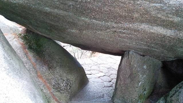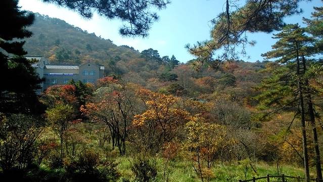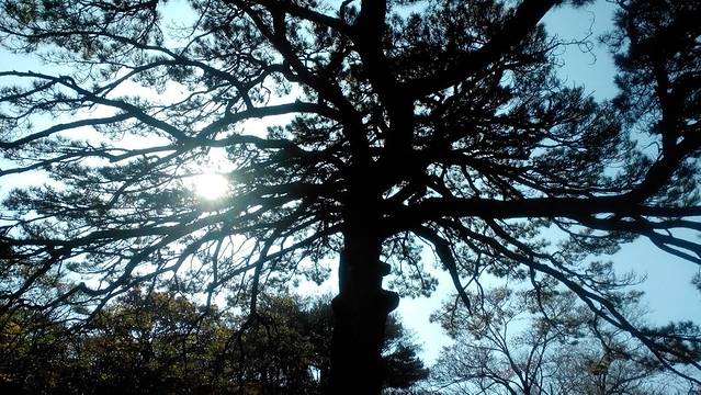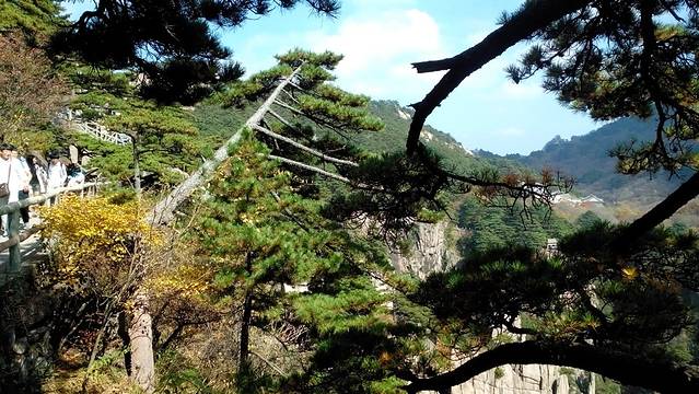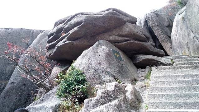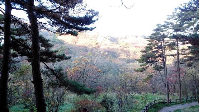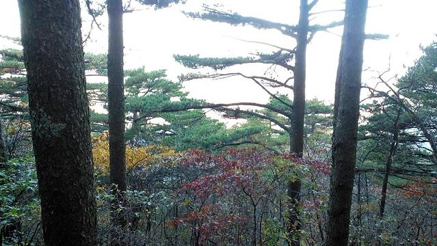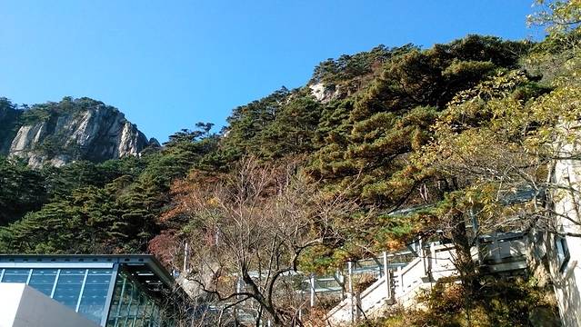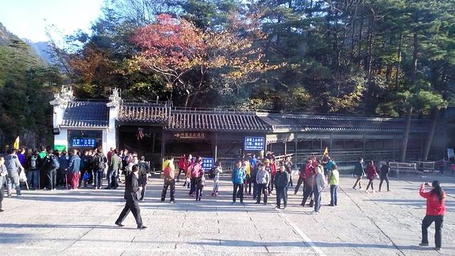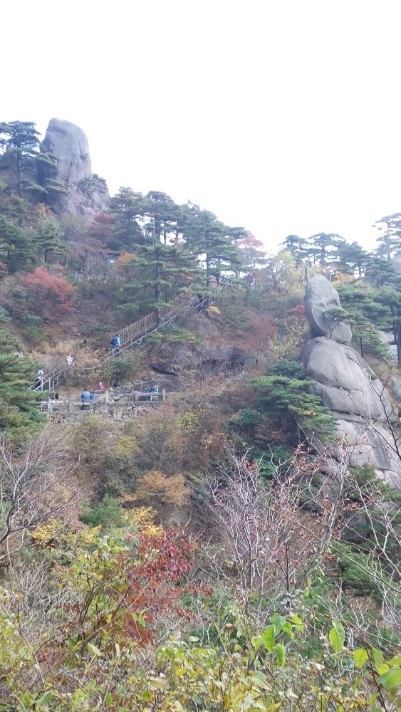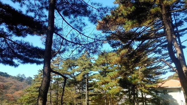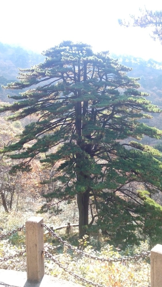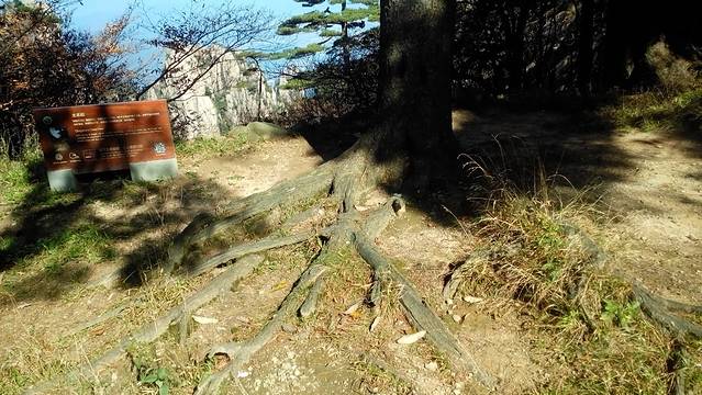 再前行左面两条高低路间就是黑虎松,导游说上方树冠形状像朝鲜文中的虎字,还说宋朝有位僧人经过此靠着树休息瞌睡,梦见黑虎现身,醒来觉得此松就是黑虎化身,所以命名...