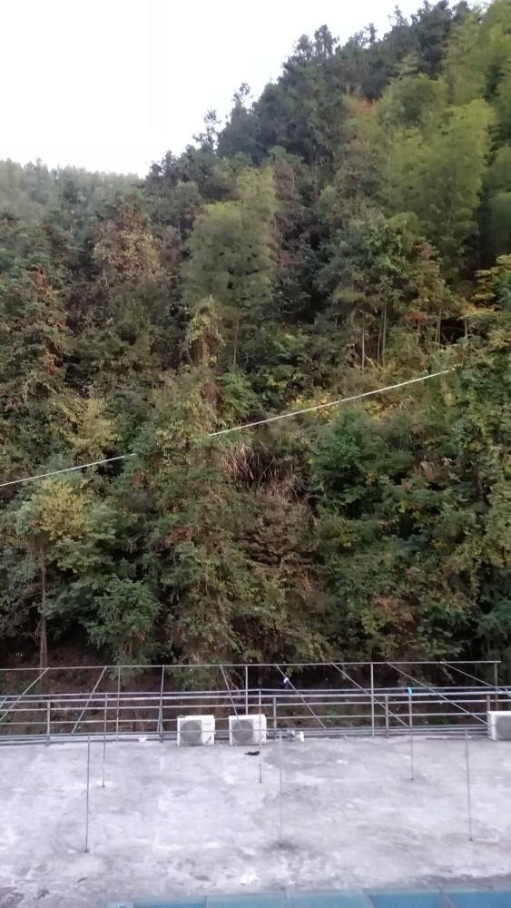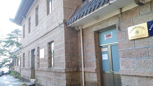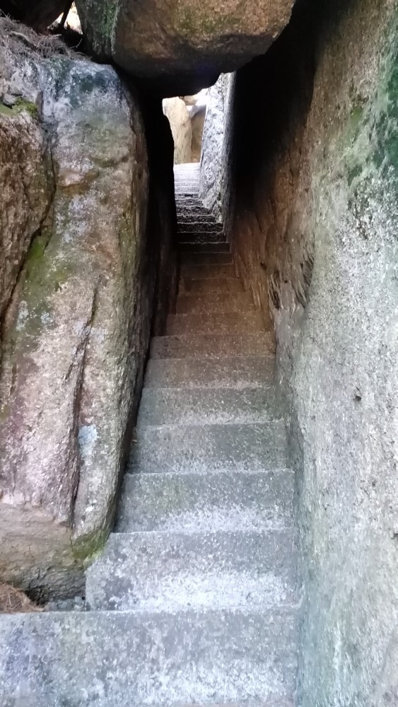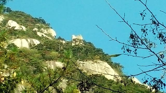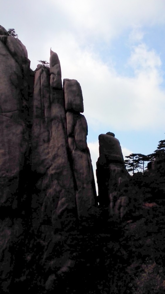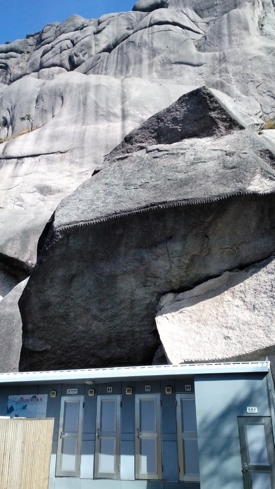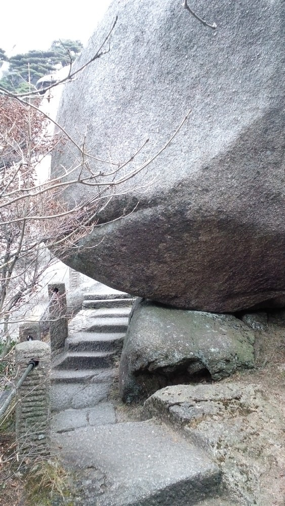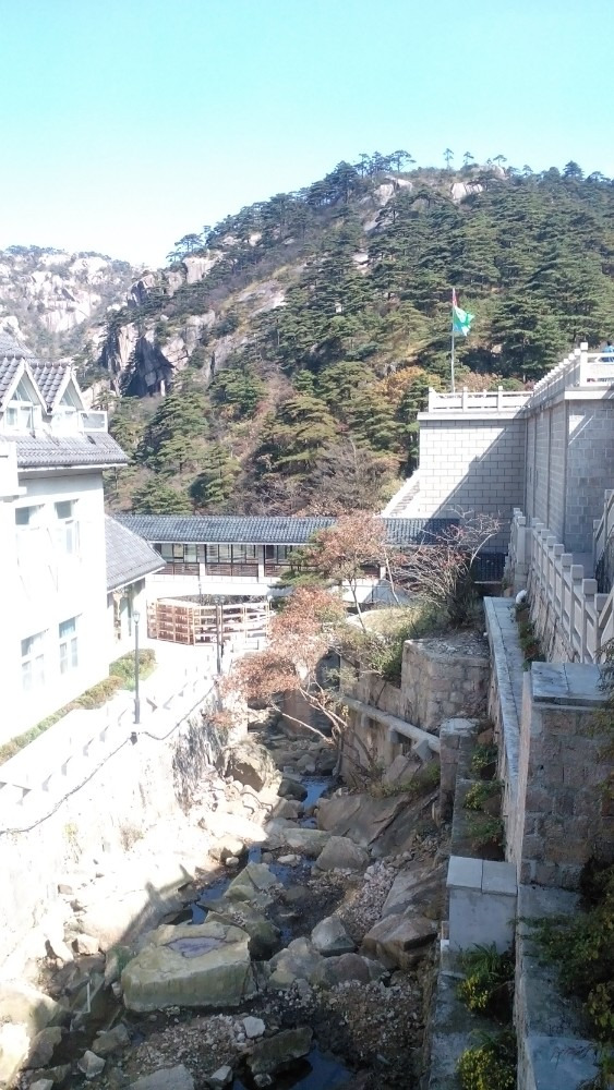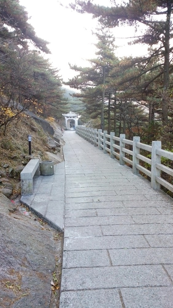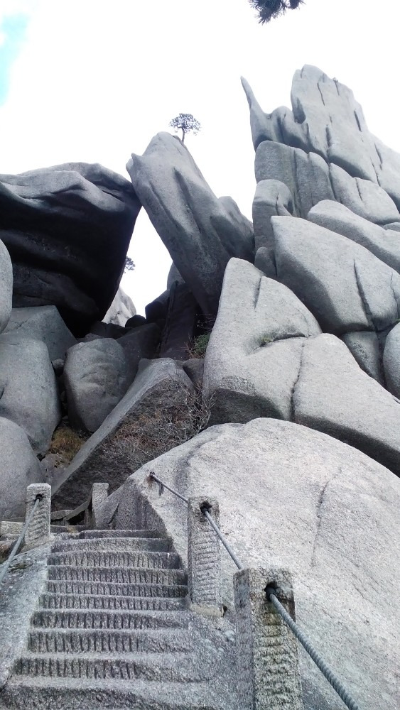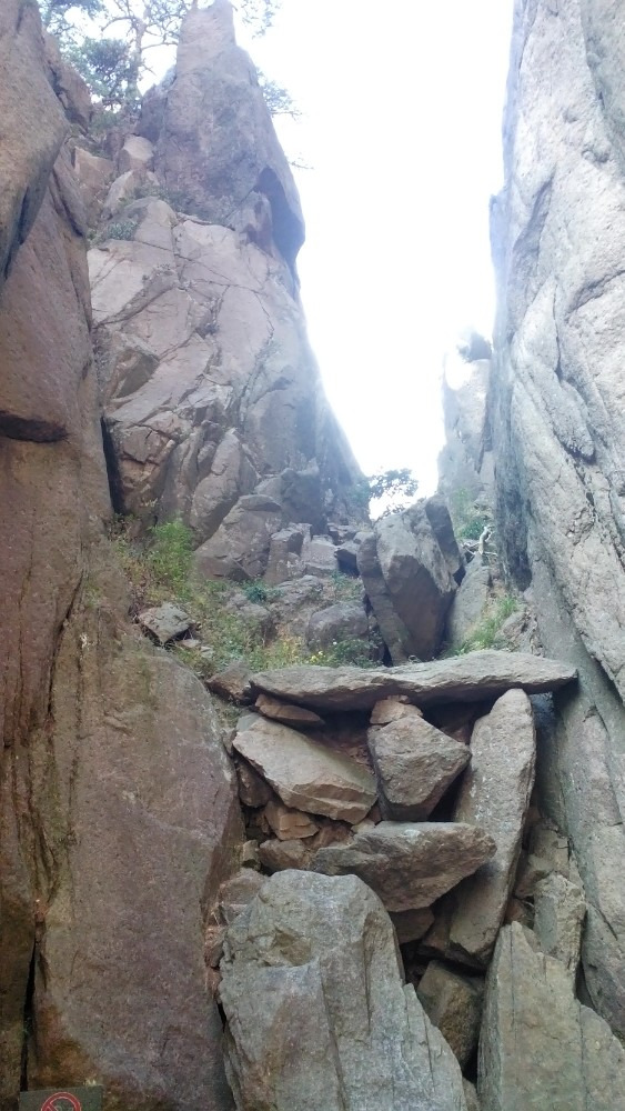 从天都下来回主路是15:09,往下再走一段看到路边时常有蓄水池,扶崖壁时发现右手手套中指处已坏了,到半山寺这有住宿的,我先在客栈前看上面的金鸡叫天门的,但被树遮住部分, 去小路到底卫生间想洗脸洗手没水,进半山寺客栈人家说我们自己都缺水哪还有水给你洗手啊,是啊山上水是金贵,于是边上石凳坐了会喝了罐红牛,没见垃圾桶就拄拐拿着空罐上十级台阶上的平台,这儿抬头看金鸡倒挺清楚就是鸡身压低了点,放地下拐杖空罐仰头拍了张,左旁石板上坐的一美女跟同伴嘀咕:好漂亮啊!(应该是看我手机取景屏在说)在拍什么呢?!我拍完艰难弯腿拿起地上的拐杖空罐,也没精力跟美女解释了,疲惫的再上台阶回主路。哎,哥在美女前是不是也太冷漠了?!...没搭讪的习惯啊...