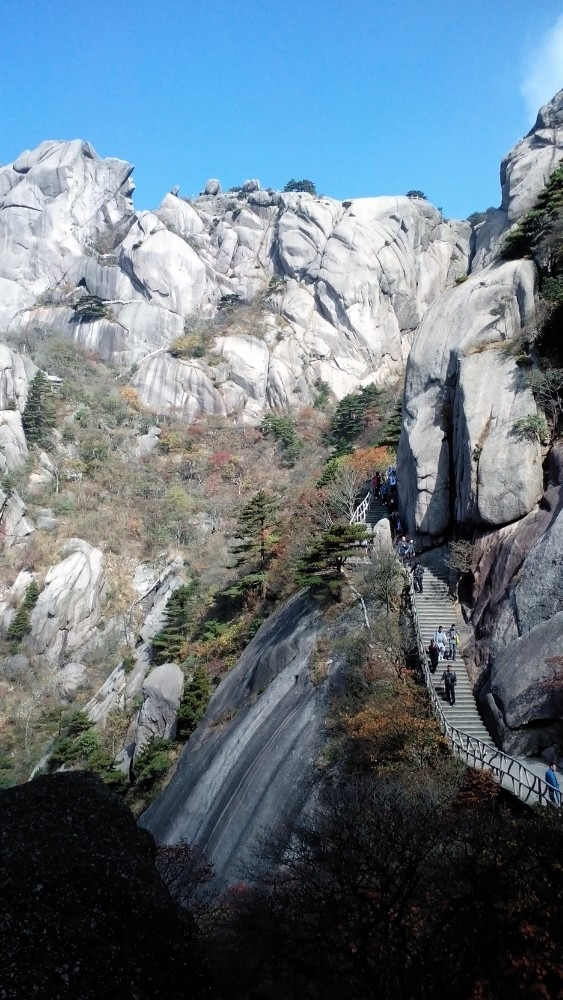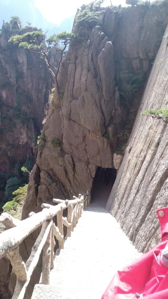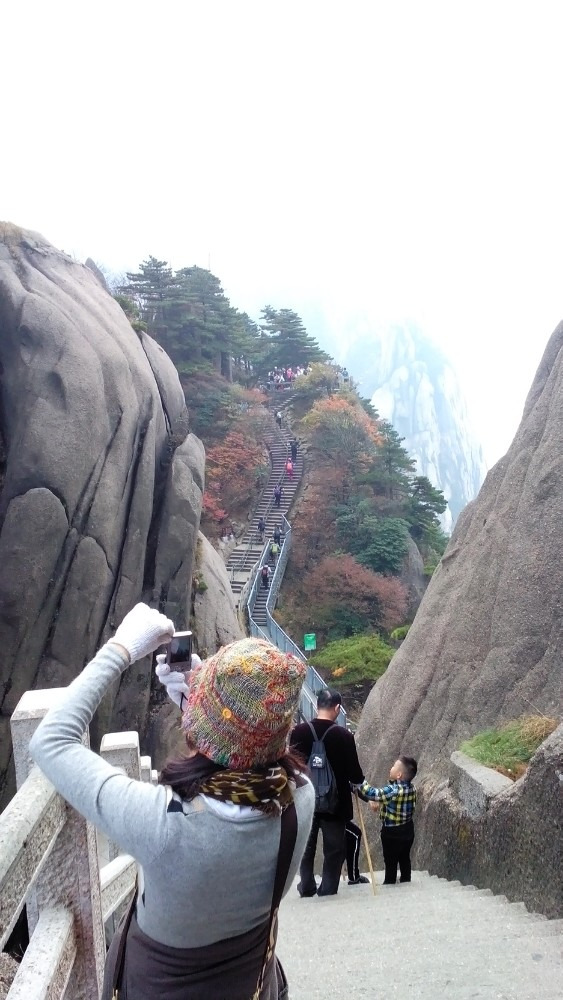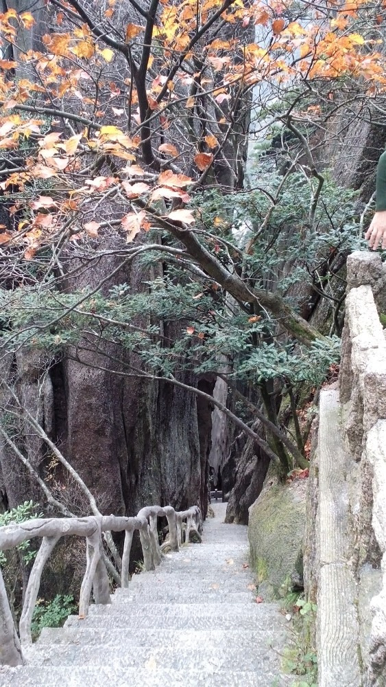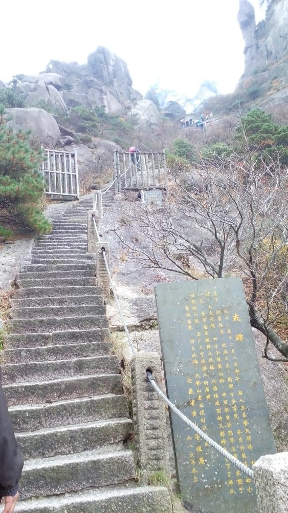 在这有个前山上天都的妹子痛喊:累死了!真不行了!可是离天都顶峰还远着呢!这位悬啊...不过我也比她好不了多少,台阶宽点处就手扶两旁倒着走下,台阶窄处就拄拐侧身左腿先直下,右腿弯曲踏上同个台阶一级一级下,在宽点主路上就八字腿形下:拐杖先60度撑下一个台阶靠右处同时左腿直斜下推出放同一个台阶,再拐杖60度撑下一个台阶靠左处同时右腿直斜下推出放同一个台阶,如此循环,看得其他游客直乐,其实我右腿不仅可以弯曲还一点不酸的,但这样可以让双腿都休息下主要靠双臂用力...