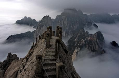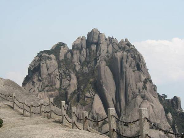 路边经过莲花亭旁的上莲花峰(2014.4月重新进入五年生态保护封闭期)石阶, 我07.5.31经过时下雨腿又酸没上去,这次封闭中只能遗憾仰视再下回来弥补,莲花峰是黄山最高峰海拔1864米,从玉屛楼望去形如含苞初放的莲花仰天绽香(光明顶看也像花),以前人们以为天都是黄山最高峰,是徐霞客实地观察(四望空碧,即天都亦俯首矣)纠正了这个错误。