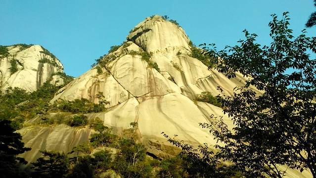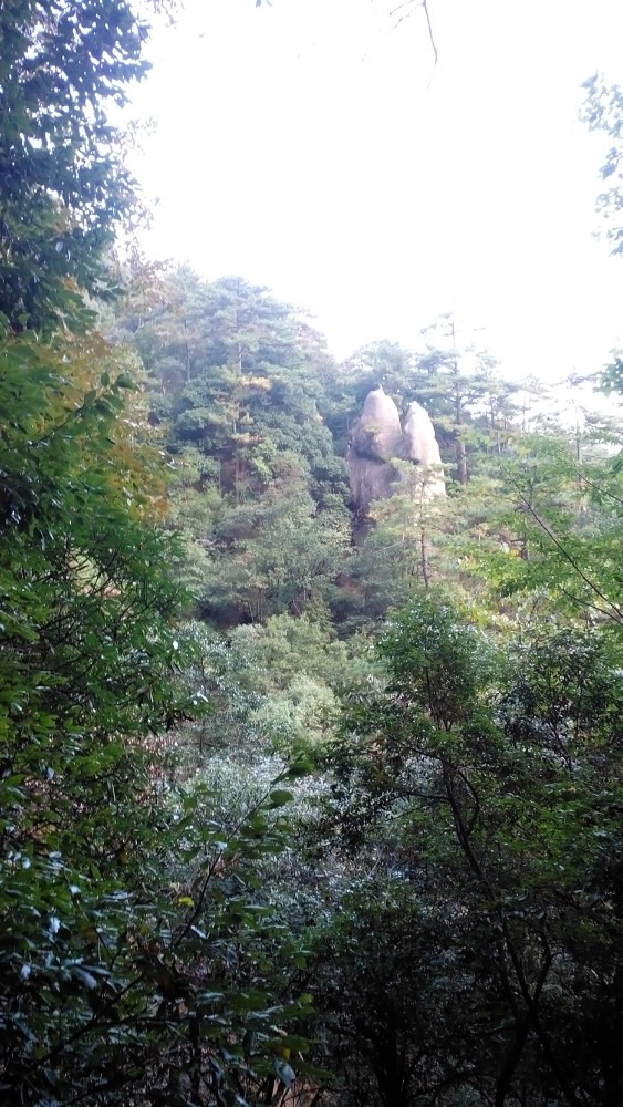 回狮林大酒店时小超市的女的在喊茶叶蛋10元三个热牛奶玉米啊!我一听去买了三个茶叶蛋不算贵,先消灭一个带两个上路,回房检查下没遗漏东西后退房背包7点开始今天的艰难征程。今天的路线先要去再翻光明观,从近路走不是昨晚飞来石群峰顶那条绕路了,去观石亭的路上清晨不断有鸟儿就在旁边的树上跳跃歌唱,一只拖着长尾的喜鹊还从我头顶俯冲过去,可惜来不及拍下来这犹如飞机盖顶的一幕,这条路的视野不错,右面飞来石的另一面清晰可见