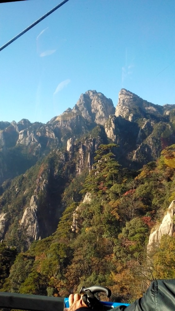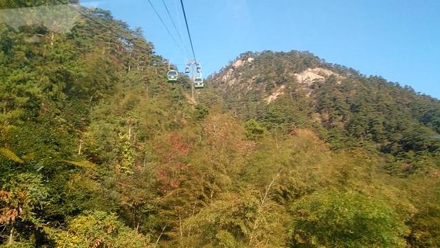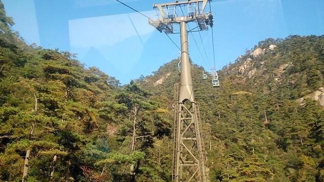 6:40酒店出发右走150米对面进去,路上已有些游客队伍向换乘中心汇拢,玉屏索道检修要到2015年5月重开,所以现在大家南门上黄山都是云谷索道或步行,排队买好车票19元,周围小旗引领下的旅游团已经不少了,再排队进室内前安检7:05坐上去索道新国线车开。