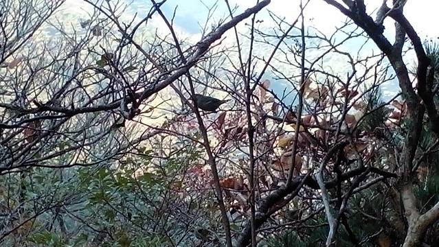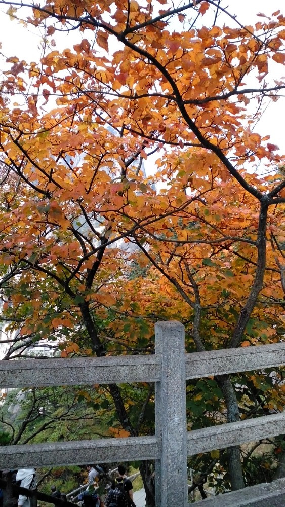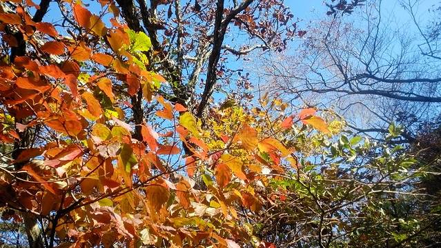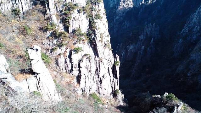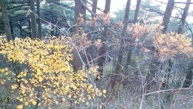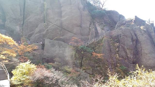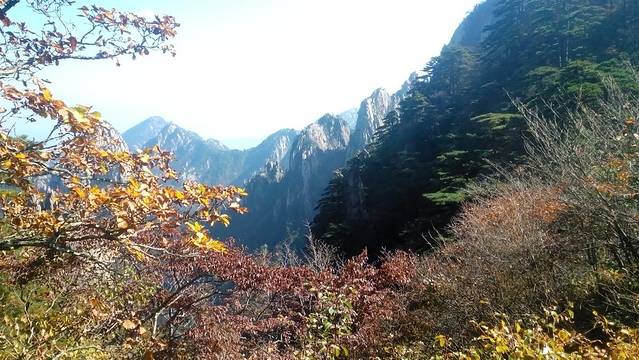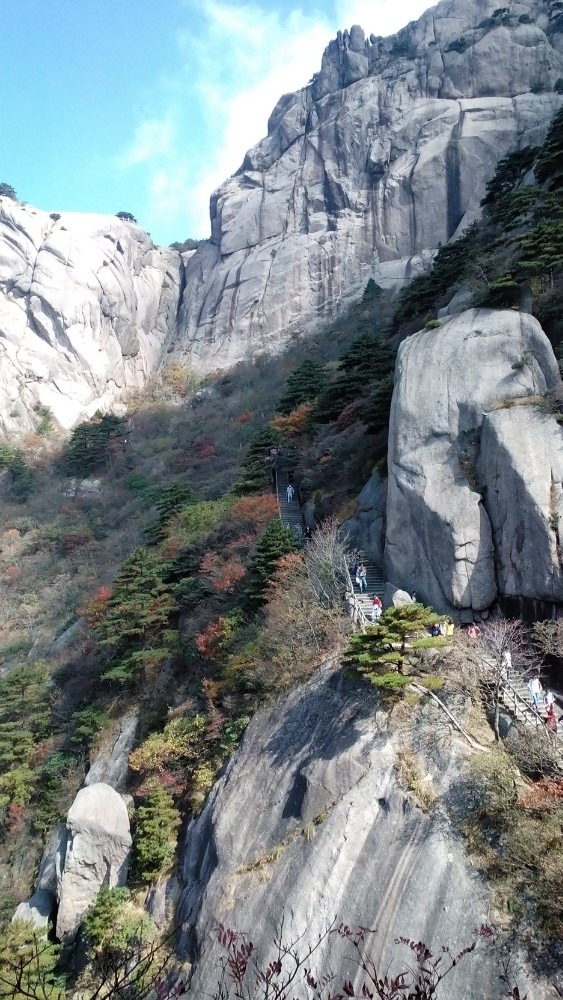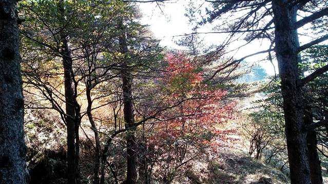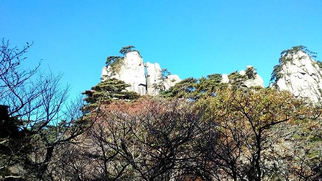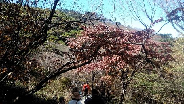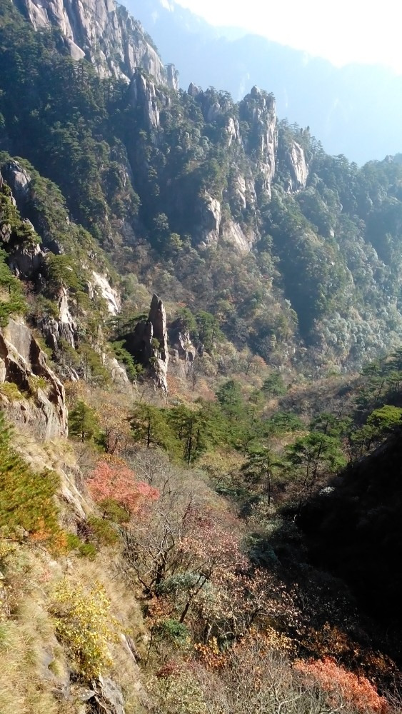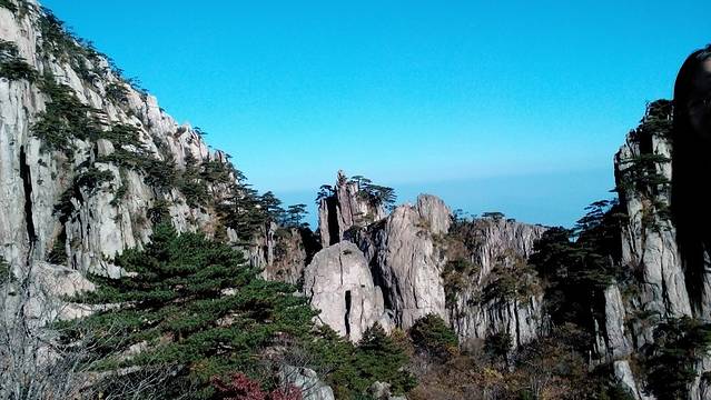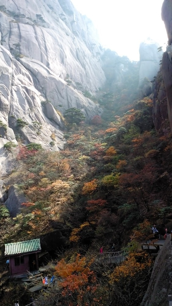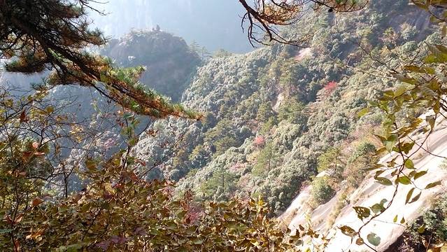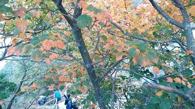 告别玉屏这继续下山,平台这路口右有棵树叶正半绿半红过渡中,过会在窄长的峡谷左边能看到蓬莱三岛,不过当中那个被树挡住了点