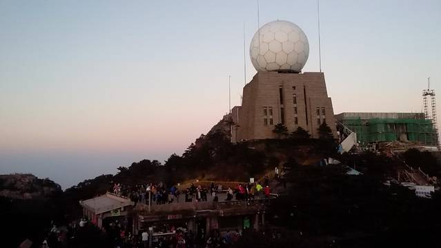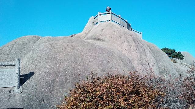皮蓬沟右面的路上去就是光明顶了,途中又见草甸和鸟儿的身影,8:30再次站上光明顶,天都峰那薄雾袅袅,一波波导游开始讲解三大主峰,松鼠跳天都,和面前远处的鳌鱼峰及顶上的金龟下蛋...我心里惦记着武侠小说的决战光明顶和黄山指南形容坦荡舒展的光明顶——“状若覆钵,旁无依附,秋水银河,长空一色”,是观日出云海的绝佳处...光明顶每天会预报明晨能看日出的概率,阿拉讲解小伙子说周六光明顶这看日出人最多了...