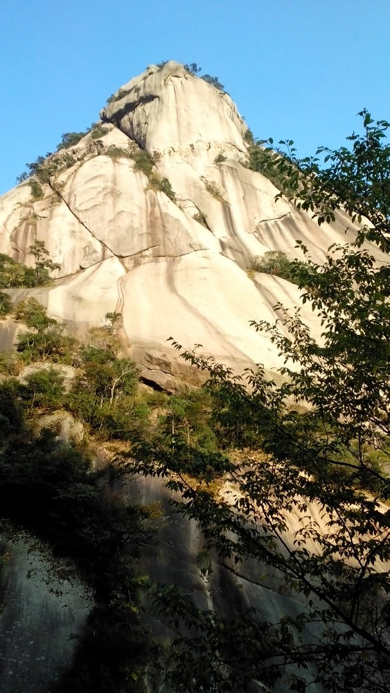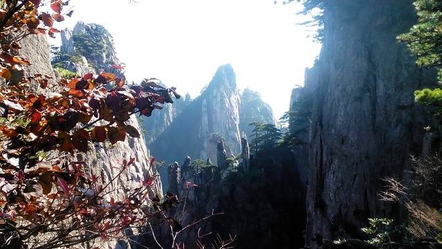 沿路转个小弯走段路就来到一个平台,面前散花坞里笔架峰和梦笔生花一左一右,但这时上午的阳光还晒不到右面山崖前的梦笔生花,右半边拍出来很暗只能调整角度右面手机再补了点光。