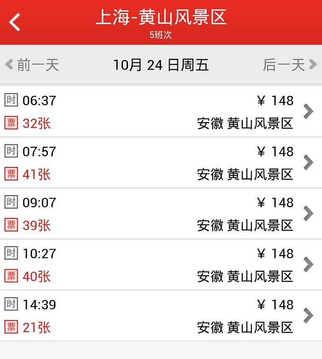 2014年上海汽车南站直接去黄山风景区(汤口)时刻五班