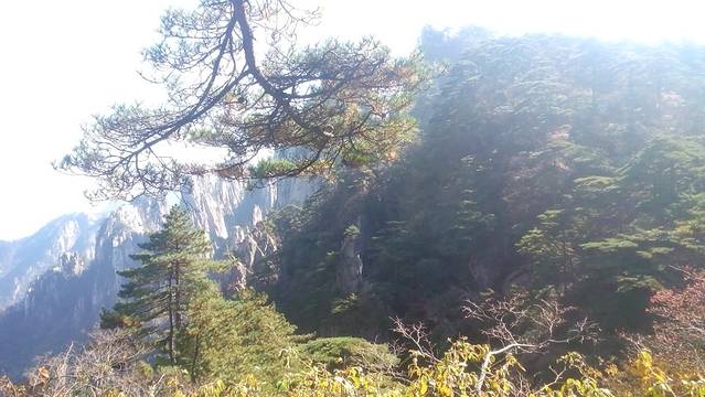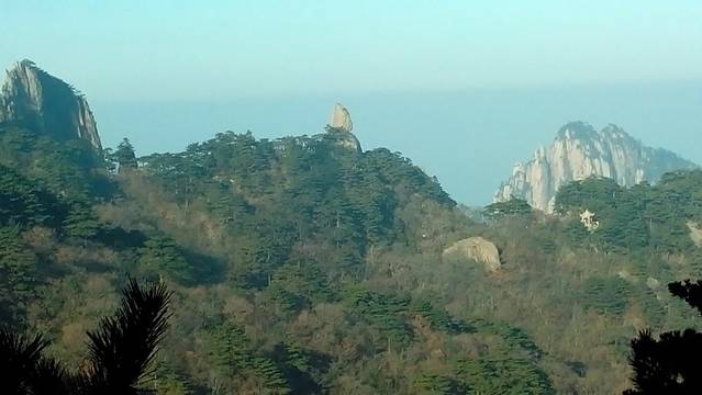 下始信峰走不远路右面就是龙爪松了,背后还有棵省树(黄山松)配省花(皖杜鹃),杜鹃是在松根上方长出的,照片中间前方远处(松针间)就是猴子观海,这景适合远观最好要有云海配合就有意境了...