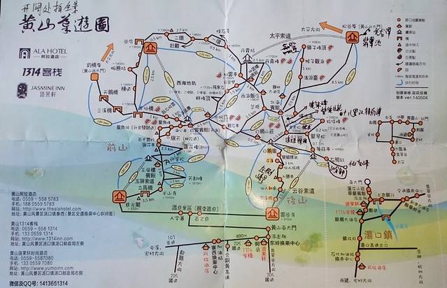 慢慢吃着边手机上网边结合自己的攻略资料和酒店给的黄山图继续研究细节... 等到晚上六点半讲解就在餐厅,就是前台嘴上有口才痣的小伙子,在网上他的口碑不错,他先问清楚不同客人山上住的宾馆和体力然后按一日游二日游(住山上)先讲解线路,再根据山上不同宾馆位置说明去看日出日落的附近山峰,周六一般在光明顶看日出日落的人最多,建议我们明早六点起床够了,旅行团大批人员多在七点后到达换乘中心(我们从阿拉酒店出门右手过去150米马路对面走进去),他说我住的狮林旁的清凉台这季节日出应该被始信峰挡住的,可再向狮林酒店询问一下。说山上这两天10-15,16度多云到晴和我出发前查的一样,我觉得他的讲解挺有激情的也挺幽默风趣,并且对不同客人有针对性,蛮好的。我一边听一边记我需要的信息,结果自带的笔芯写完,去酒店小卖部3元新买支水笔(前台几支笔都被其他客人借去了)继续认真听记,后来我问了下他一些信息如丹霞峰那条路现在是否能通到主路,他说峰顶小门是封住的,但环路通否不能肯定,回房前我买了他推荐的自热米饭品牌14元,全身雨衣10元(半身5元,山上没拆用过可来换其他物品),火腿肠4元(还有3元的),两只棉纱手套2元(一元一个),因为现在山上防止白色污染禁售方便面,所以我也支持环保不带方便面上黄山,另外在上海出发前我已买好矿泉水红牛饮料士力架苹果园几种面包等。