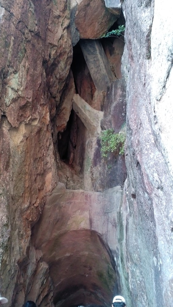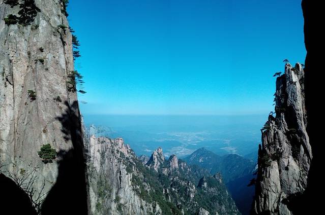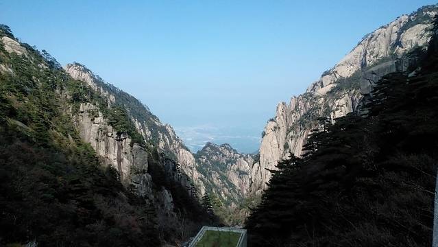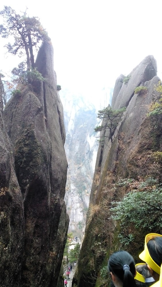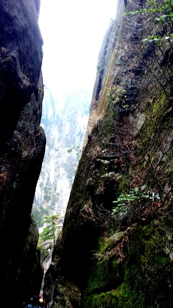 继续下走,陡峭峡谷缝隙中的远前已经能看到上天都的天梯