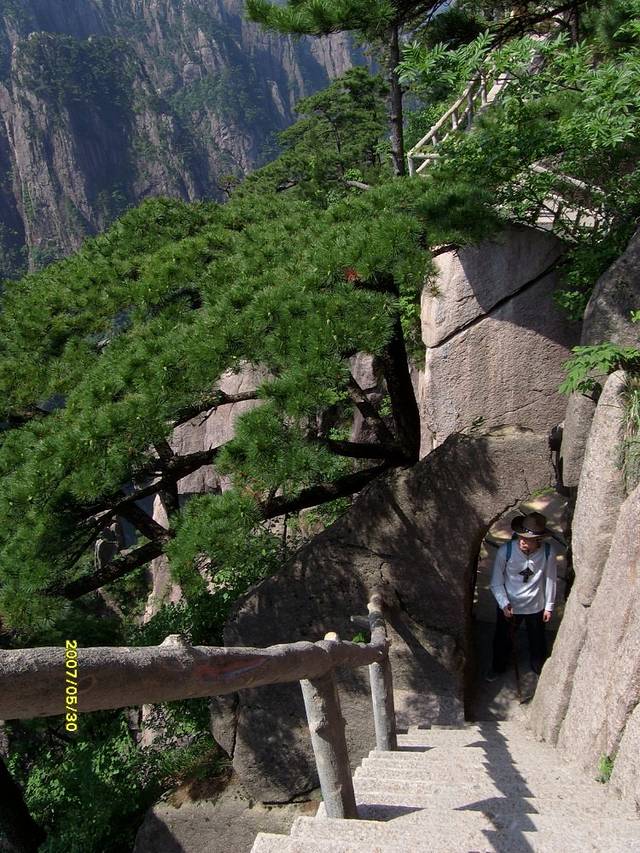 地轨上站叫西海瑶台,走不远右侧有路可去步仙桥来回约三小时(汤口阿拉讲解的小伙子说这风景西海里都属于好的有体力的去走走观赏),我07.5.30去过那,这次时间来不及去接下去还要去光明顶飞来石回狮林大酒店呢,左腿膝盖反面弯曲处已开始酸了,右腿倒一点没事,哎,已经走得这么慢了左腿还是不争气啊...
