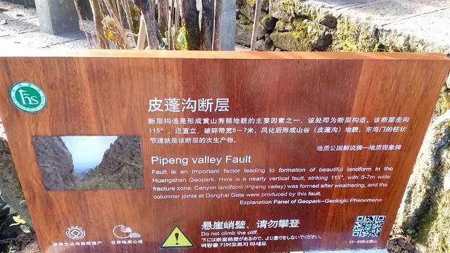 路的笔直尽头就是皮蓬沟断层,可在平台看峡谷地质,两外国小伙在平台左侧的岩壁上攀爬,动作挺轻巧的。