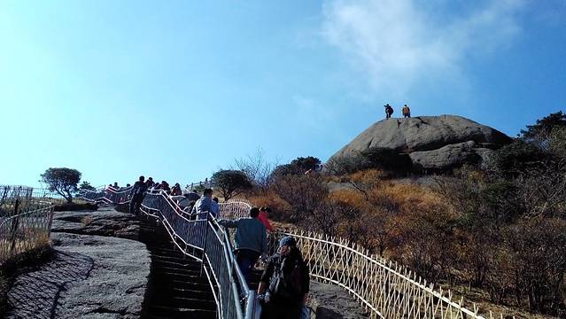 过百步云梯(有199级,徐霞客形容梯磴插天,足趾及腮,而磴石倾侧谽谺,兀兀欲动,...至此骨意俱悚)时我咬着牙像个小中风的帕金森似的捱过去,心里想老徐啊,我比您惨多了啊!左腿一弯就酸没办法只能拄拐一级一级过啊...