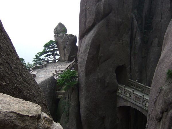 在岔路口左先能看到竖琴松(旁边是蘑菇亭),右面崖壁上是探海松