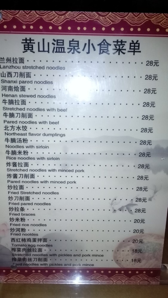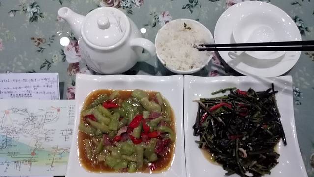 点了火腿丝瓜28元+黄山一蕨28元+饭2元~58元晚餐,味道还行,不是很重口味,服务员向我介绍徽州风味臭鳜鱼(好像58元)和毛豆腐,因为第一次来黄山时在市区(屯溪)就尝过了,不是我喜欢的风味就不吃了,再说一个人吃两个菜足够了。