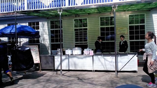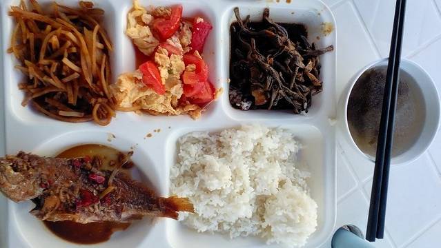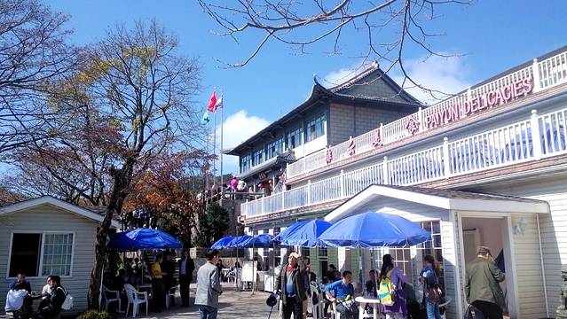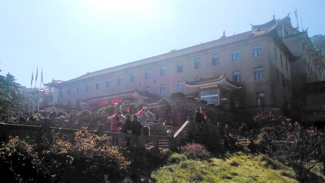 过桥后在排云楼宾馆前吃的快餐60元,另有50元的,去右面室内餐厅买餐劵出来领就行,味道还行,在室外休闲桌椅用餐休息了会,来往的人挺多,和左边坐着的两个餐厅里吃完出来的河北的男游客聊了会