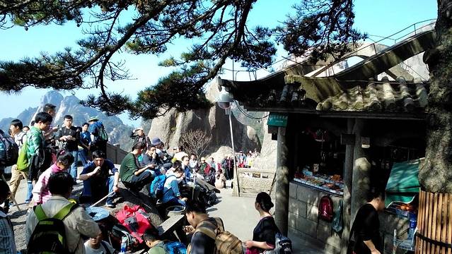 在迎客松上面点心摊档室外桌椅10元买了个肉粽吃,30元的快餐已卖完了,再吃了点自带士力架面包火腿肠休息了会,问了下边上派出所爬天都需多久再和摊主扯了会,说玉屏这直接下山一小时,爬个天都下要四个小时而且天都前山路很窄很陡,摊主看见我带着自热米饭说他也吃过太硬了,边上正吃自热米饭的小伙子说他自己弄不来!