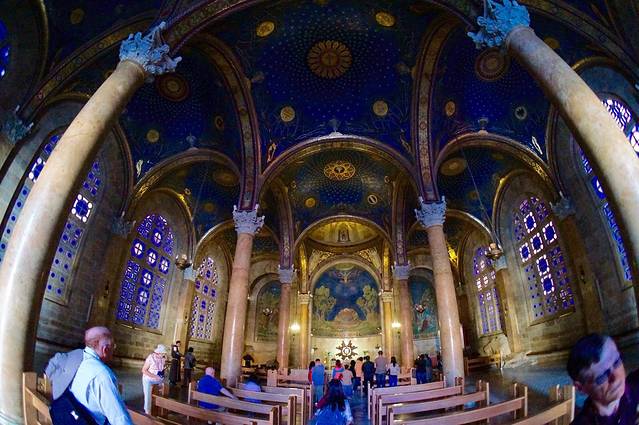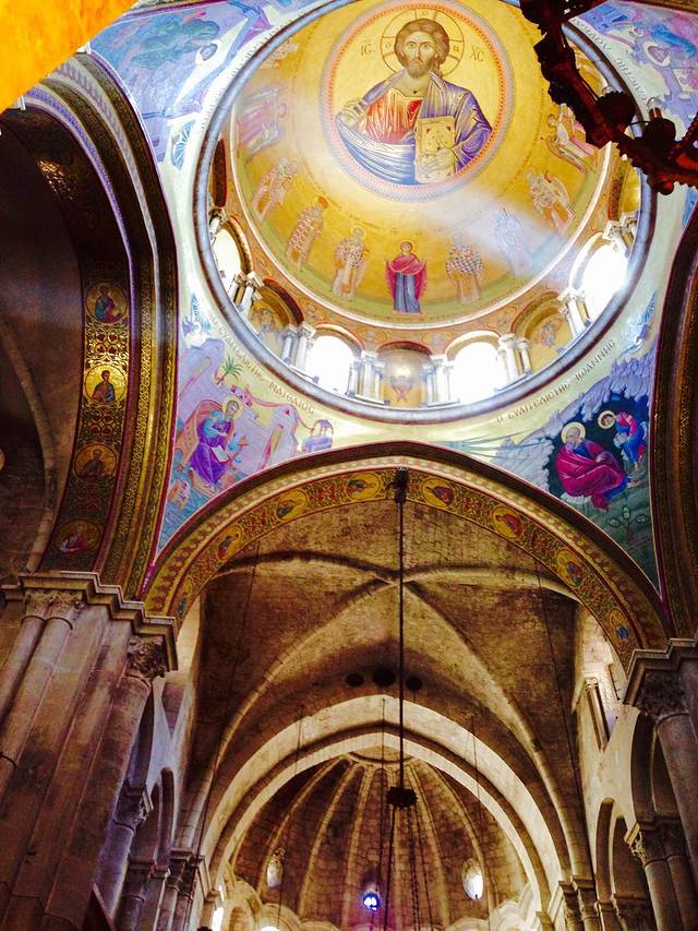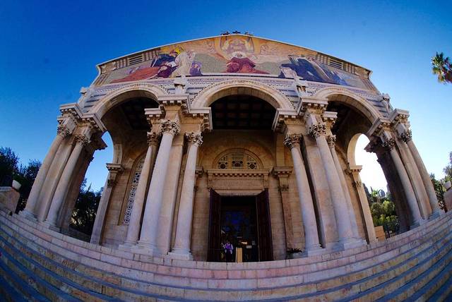 Church of All Nations 又名Agony教堂,位于耶路撒冷城东部的橄榄山,毗邻喀西玛尼园。这座教堂建于1919年到1924年,得到许多不同国家的资助,因而得名。每个国家的标志放置于天花板的玻璃上。