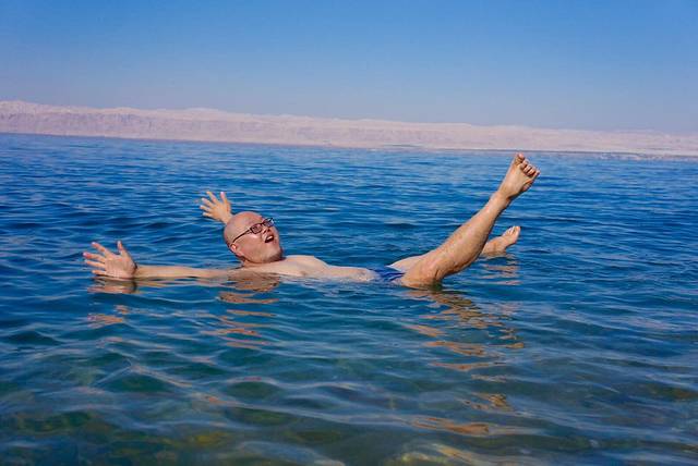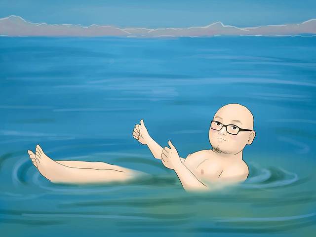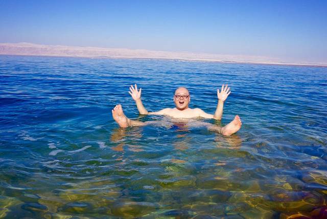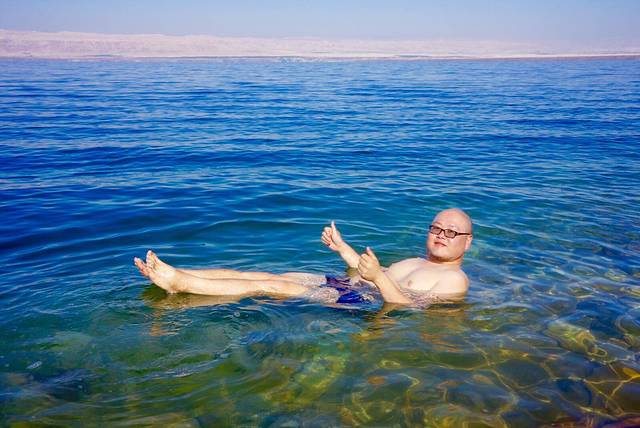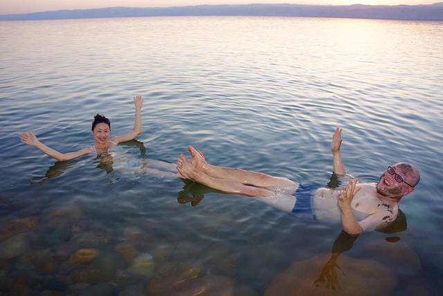 死海被称为地球的“肚脐眼”,是世界上最低的湖泊。死海位于约旦和以色列的交界处,湖面海拔负422米。死海的湖岸是地球上已露出陆地的最低点,湖长67公里,宽18公里,面积810公里。死海是世界上最深的咸水湖,最深处380米,湖水盐度达300g/L,为一般海水的8.6倍。忘记带本书摆POSE了!