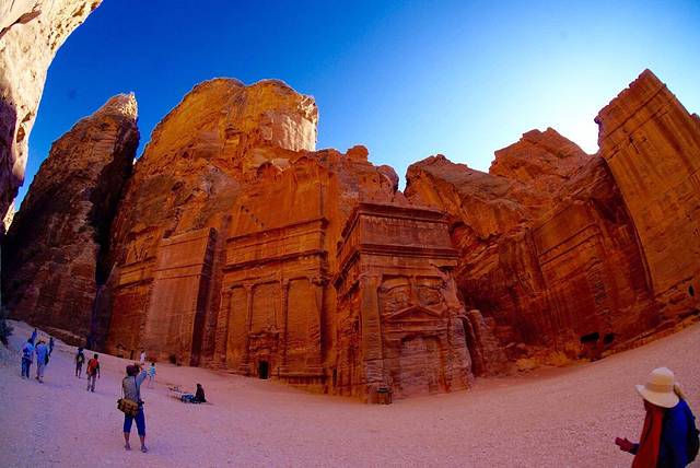 来到约旦必须要去看看世界文化遗址——佩特拉古城。佩特拉古城位于约旦南部沙漠,距首都安曼约260公里、海拔1000米的高山峡谷中。它几乎是全在岩石上雕凿而成,佩特拉遗址的岩石带有珊瑚宝石般的微红色调,在阳光照射下熠熠发亮。特殊的地貌使它呈现出绝美的颜色,所以又被称为“玫瑰古城”