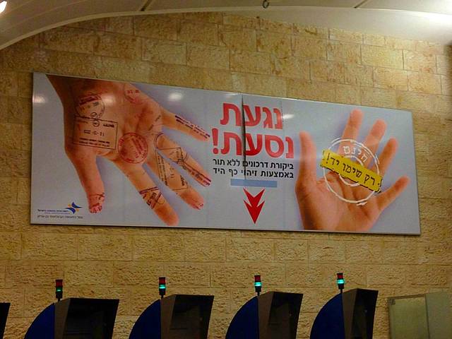 办好票后常规过关和安检,要首先到登机口,出示护照上贴的那个纸条,登机口会有专人通过纸条上的记号告知你是否还需要二次安检。二次安检的人会被带到一个小屋里,由以色列安全人员操着熟练的中文反反复复问你一些问题,并对你的行李开箱查验。安全人员会对行李里的所有东西进行扫描,然后将数据输入电脑。